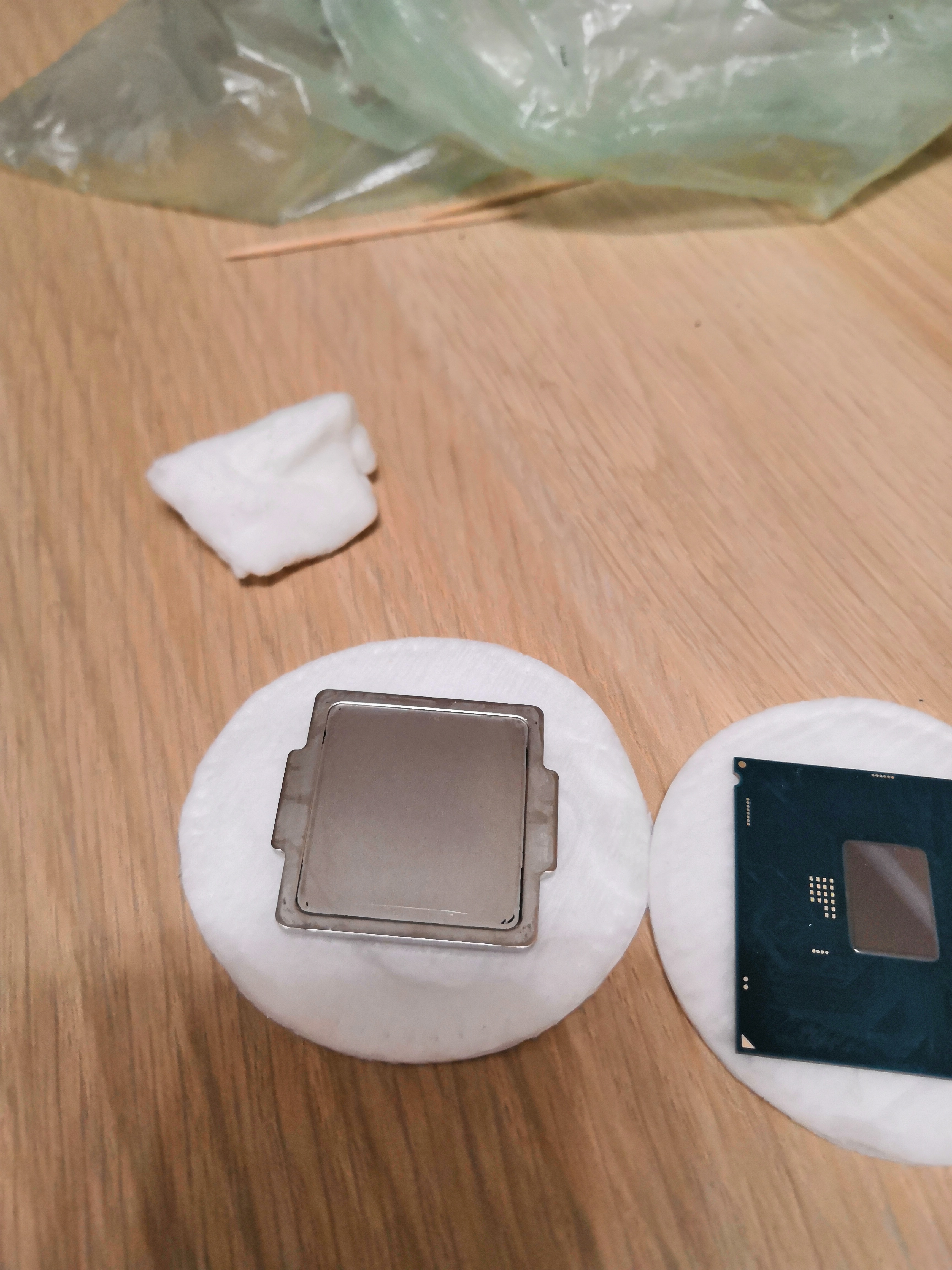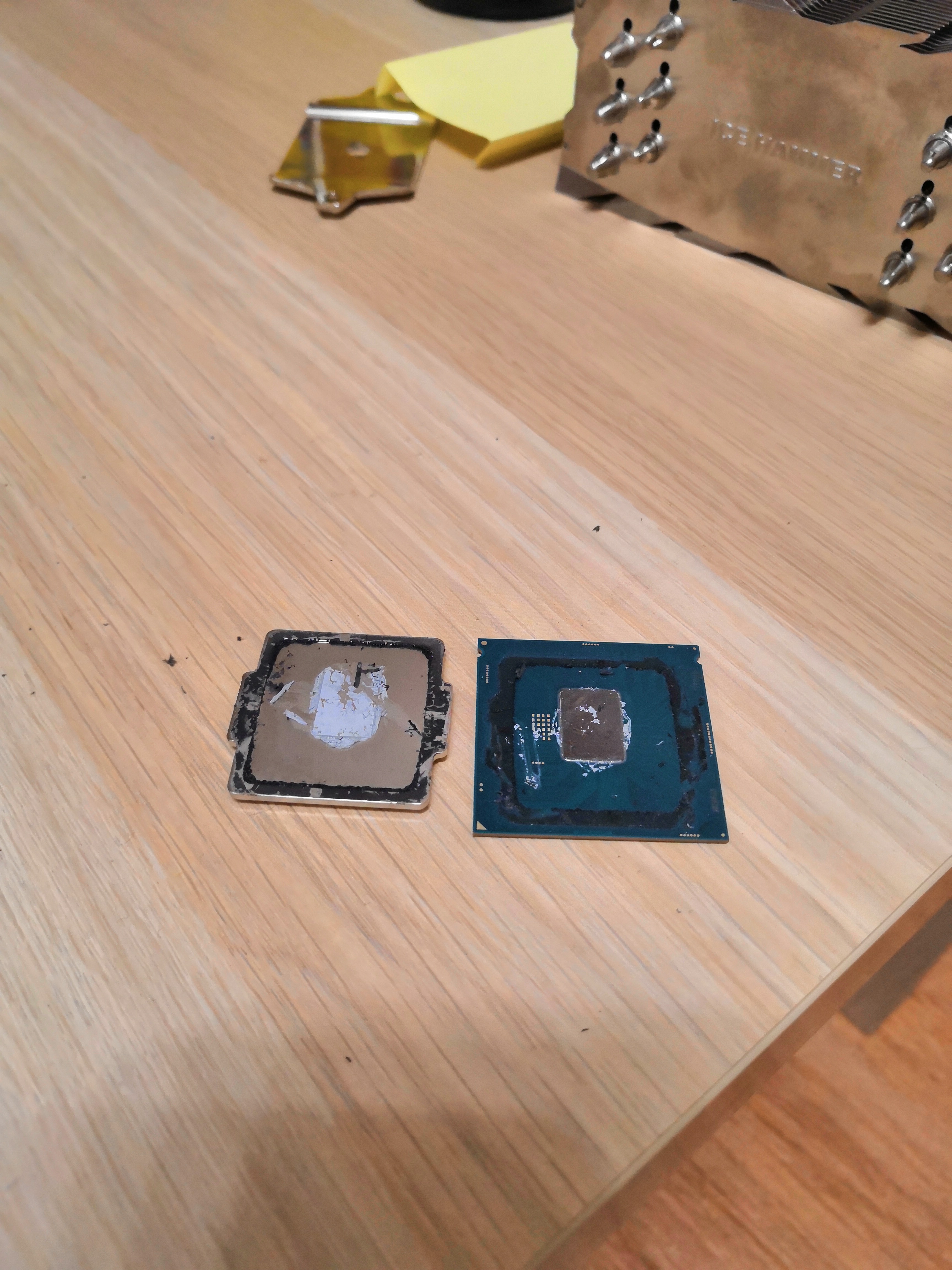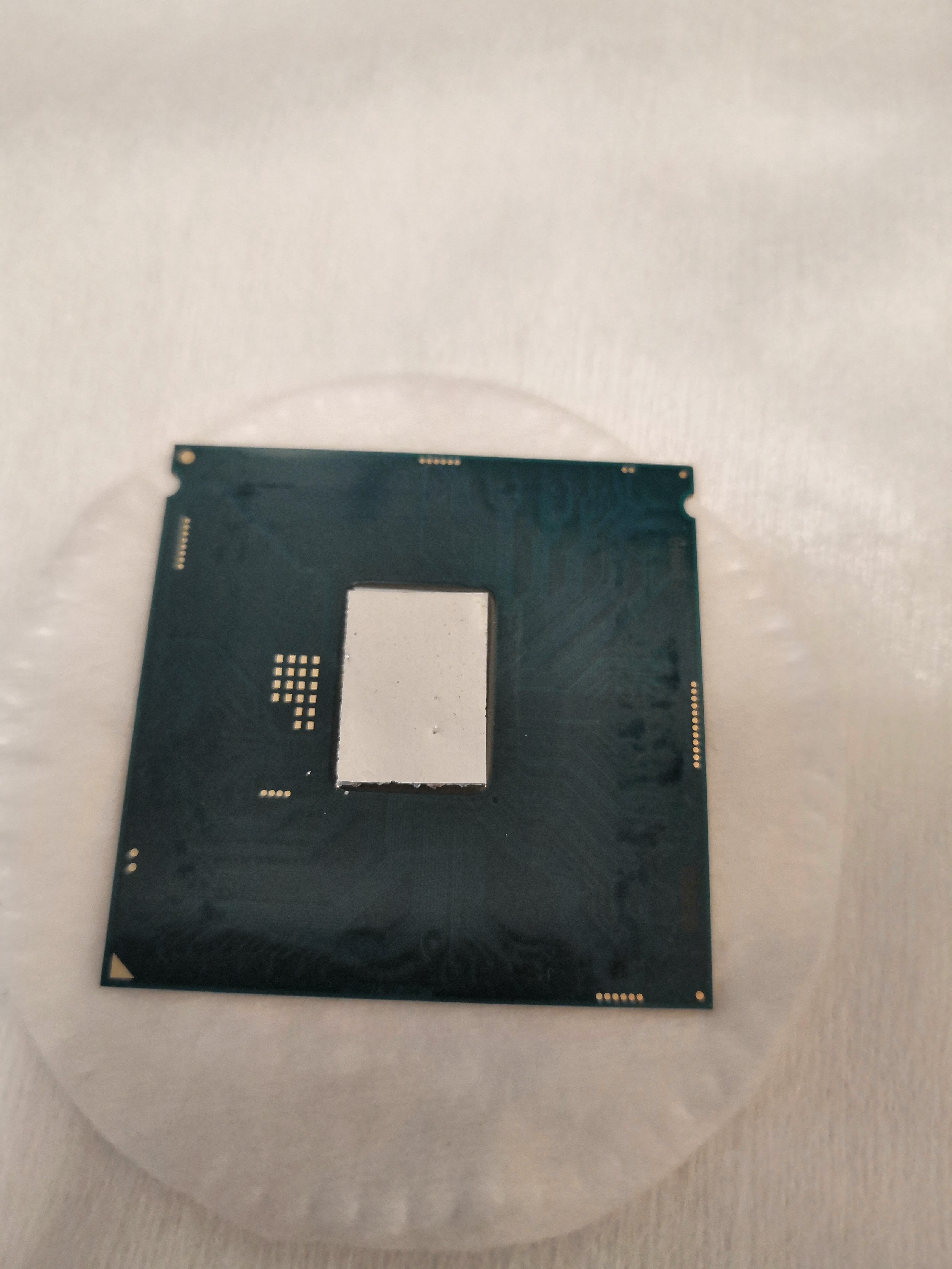 В дополнение к посту про снятие крышки замачиванием Хочу снять крышку с процессора. Посоветуйте как и стоит ли? Всё о скальпировании процессоров... #15831808 В вечер пятницы наконец дошли руки до того, ради чего это все собственно затевалось - замена термополимера под крышкой qhqg на жм . Приобретен за 370 руб. самый маленький/дешевый из coollaboratory liqud metalpad (это тот который в виде фольги и плавится при 60С). т.к. крышка на предыдущем этапе (с гелид экстрим под крышкой) не приклеивалась, то никакой возни с вымачиванием повторно не проводилось, проц был просто вынут из гнезда. судя по отпечатку термопасты крышка и чип ровные ( в отличие от подошвы кулера ), контакт идеальный. Паста стерта, а крышка и чип 100500 раз тщательно протерты ацетоном (50 руб.) и универсальным обезжиривателем (тоже 50 руб. и почему то пахнет также как бензин галоша). Далее прямо в упаковочной бумажке фольга отрезана по ширине кристалла (9 мм), после тщательной укладки на чипе, аккуратно протыкана пинцетом и по линии перфорации подогнана на высоте (13 мм - могу ошибиться, т.к. уже не замерял). Поэтому на фотке нижний край фольги неровный/рваный + фольга немного неровно лежит (исправил до фиксации, о причинах ниже).