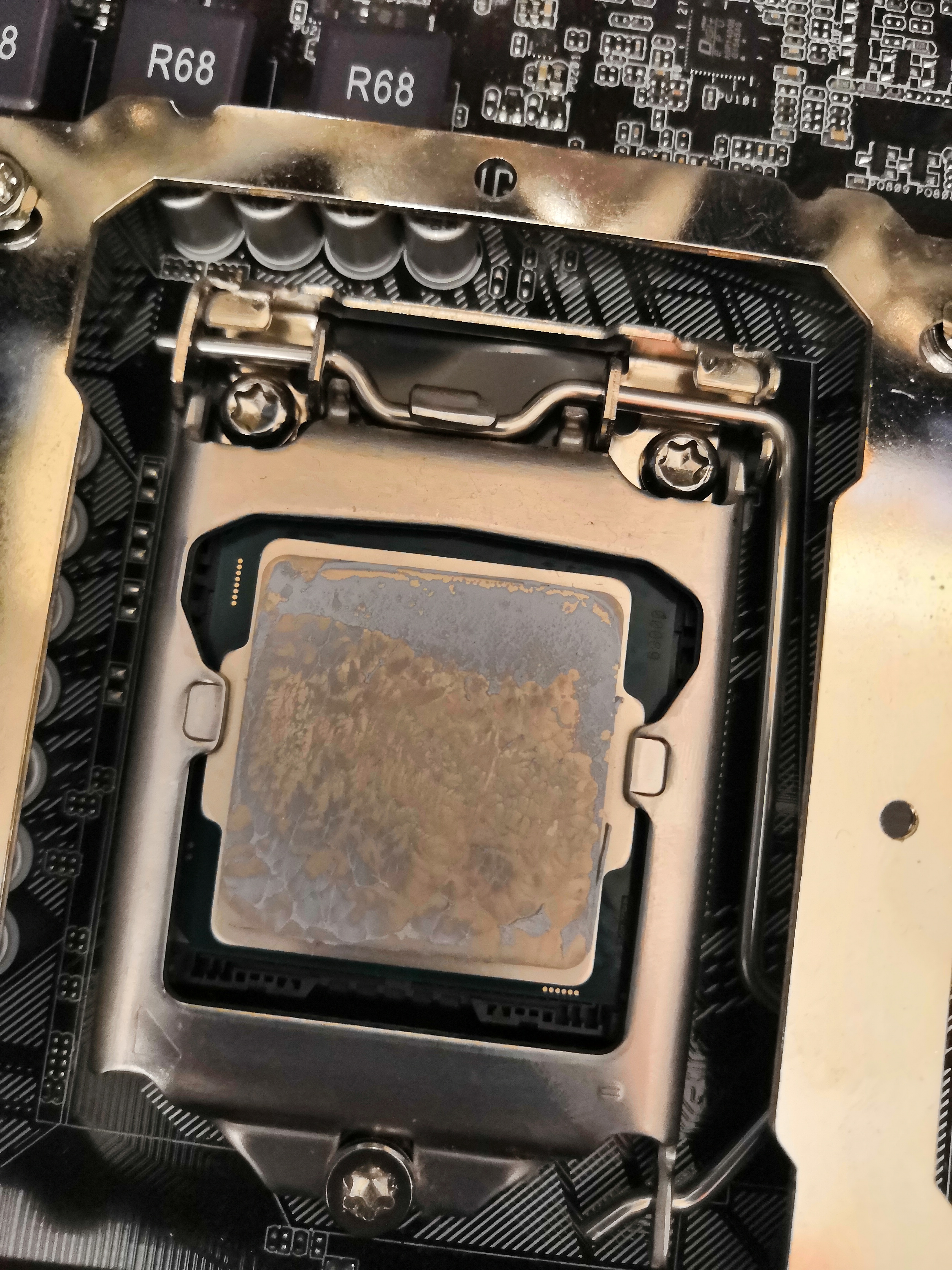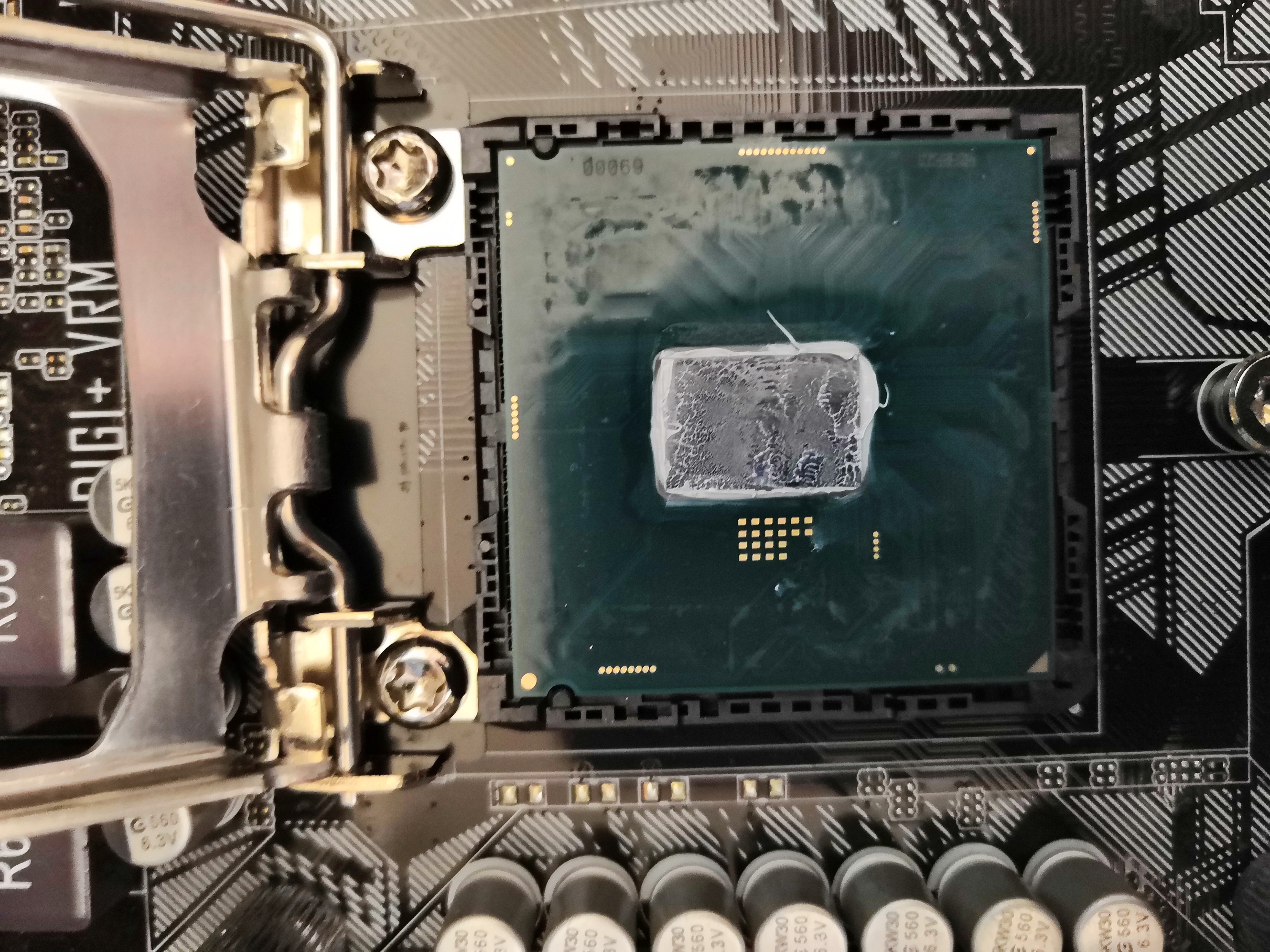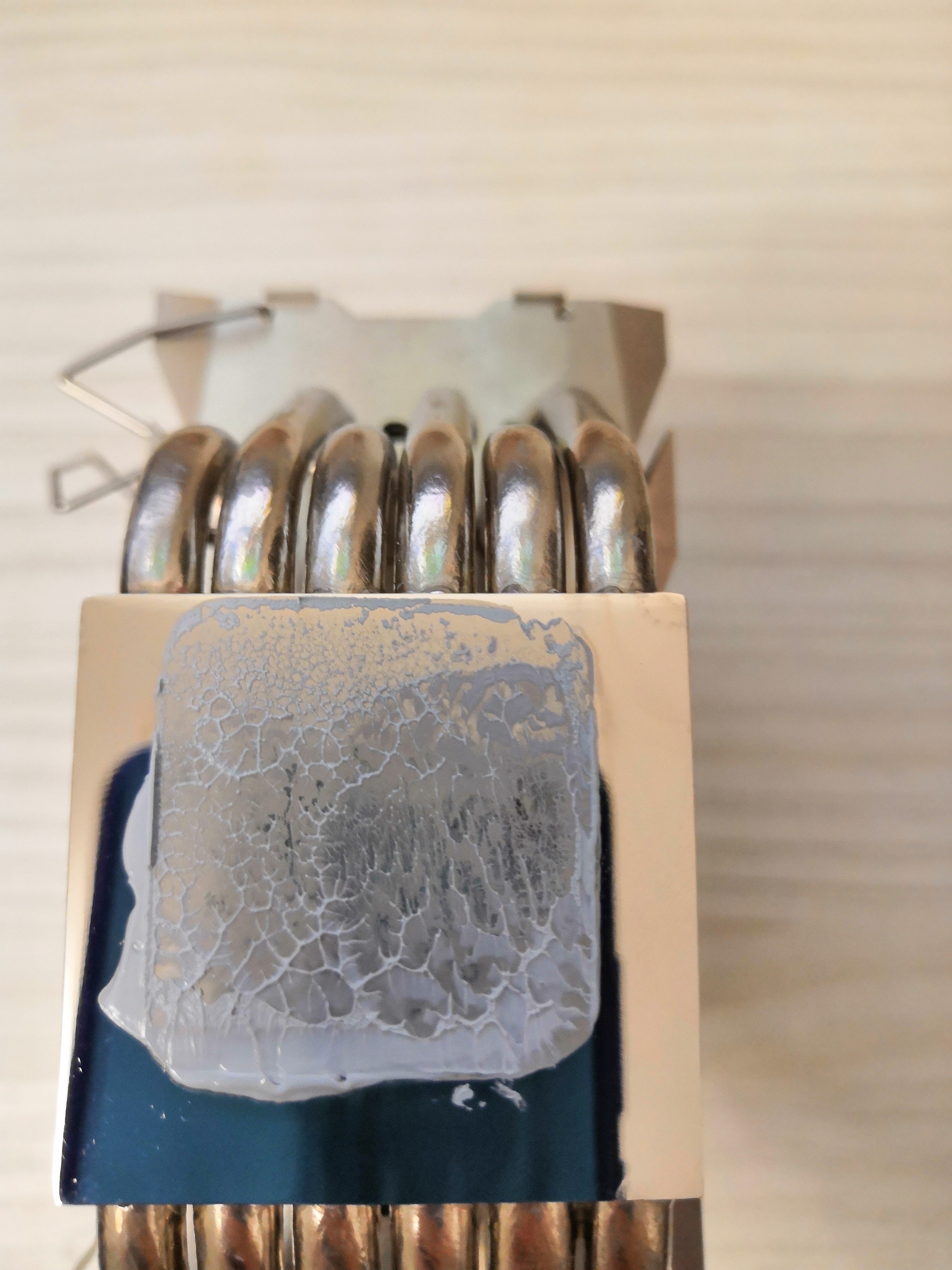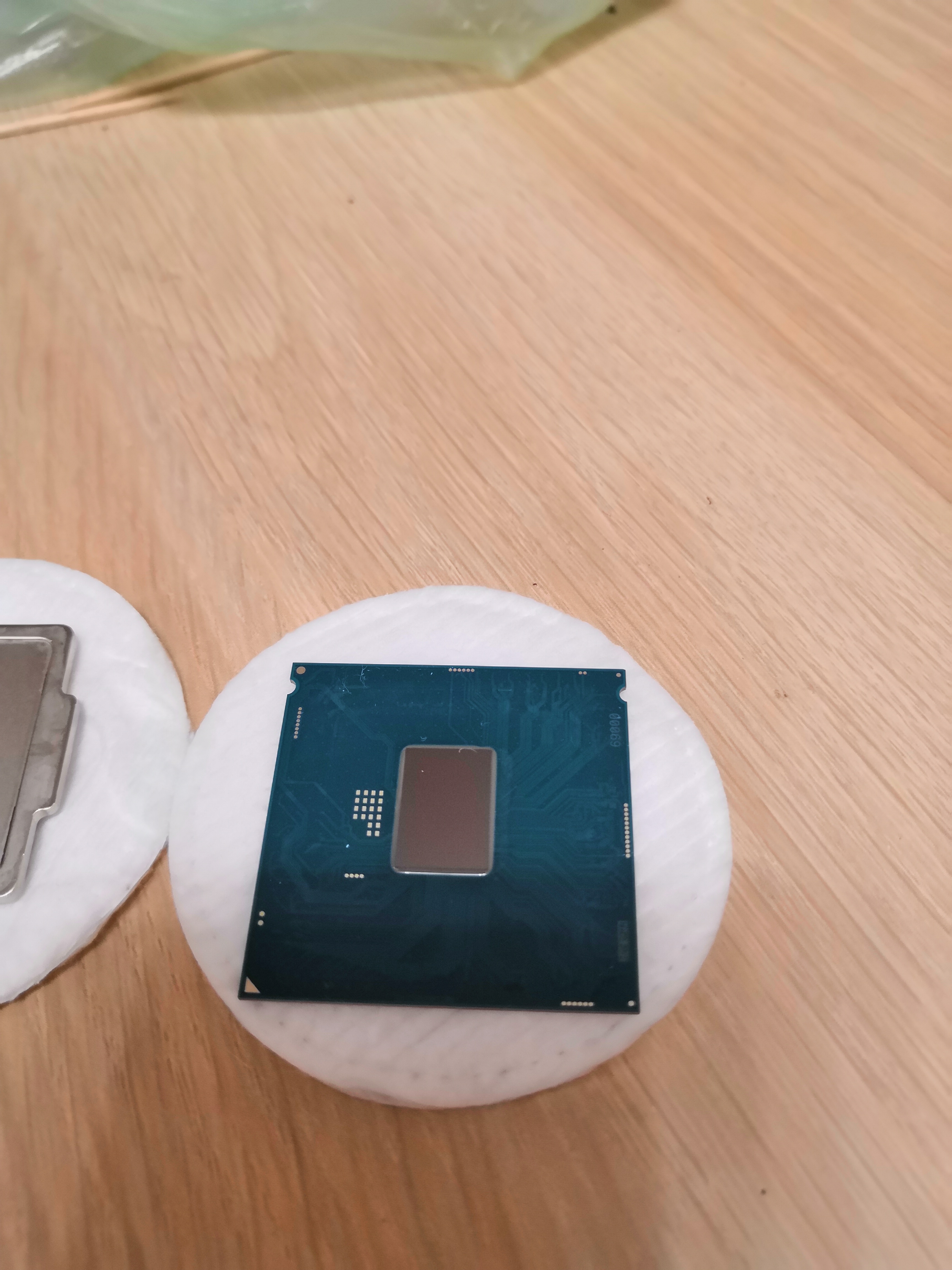 В дополнение к посту про снятие крышки замачиванием Хочу снять крышку с процессора. Посоветуйте как и стоит ли? Всё о скальпировании процессоров... #15831808 В вечер пятницы наконец дошли руки до того, ради чего это все собственно затевалось - замена термополимера под крышкой qhqg на жм . Приобретен за 370 руб. самый маленький/дешевый из coollaboratory liqud metalpad (это тот который в виде фольги и плавится при 60С). т.к. крышка на предыдущем этапе (с гелид экстрим под крышкой) не приклеивалась, то никакой возни с вымачиванием повторно не проводилось, проц был просто вынут из гнезда. судя по отпечатку термопасты крышка и чип ровные ( в отличие от подошвы кулера ), контакт идеальный. Паста стерта, а крышка и чип 100500 раз тщательно протерты ацетоном (50 руб.) и универсальным обезжиривателем (тоже 50 руб. и почему то пахнет также как бензин галоша). Далее прямо в упаковочной бумажке фольга отрезана по ширине кристалла (9 мм), после тщательной укладки на чипе, аккуратно протыкана пинцетом и по линии перфорации подогнана на высоте (13 мм - могу ошибиться, т.к. уже не замерял). Поэтому на фотке нижний край фольги неровный/рваный + фольга немного неровно лежит (исправил до фиксации, о причинах ниже).