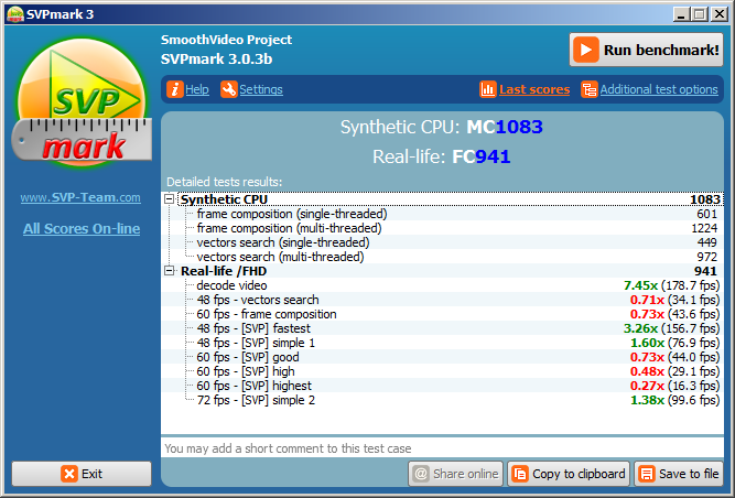 Спасибо за числа. Но какие-то странные они. Точно самые высокие настройки? Может быть всё-таки просо "good"? Какая версия SVP? Просто если поглядеть на табличку SVP Mark и найти там близкие к 1343 в графе Adj to FHD конфиги , то видно что в настройках "highest" частота кадров порядка 24-30 к/c, в то время нужно 60к/c, а лучше с запасом.