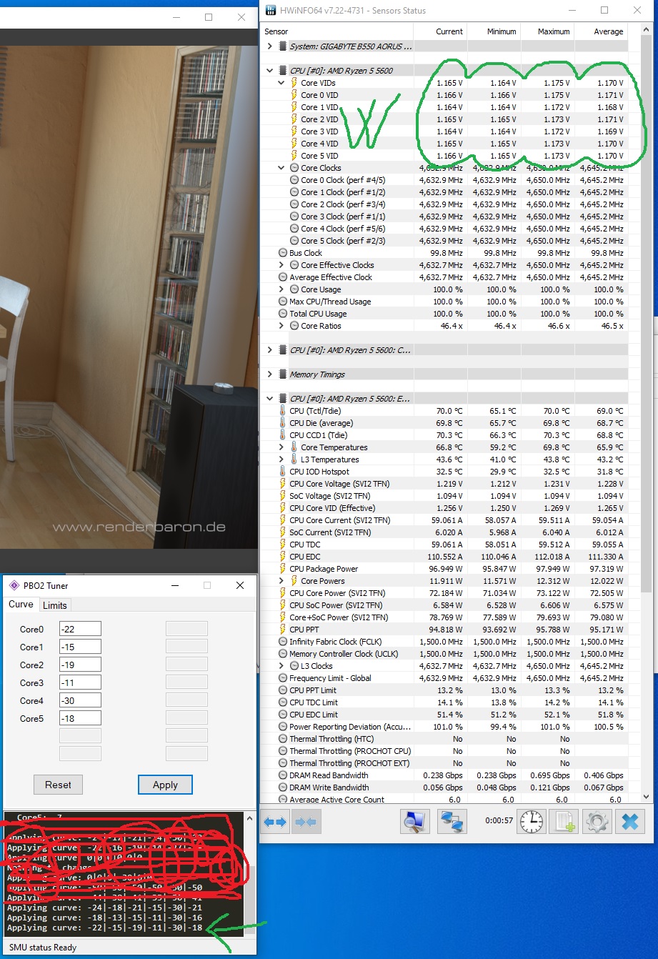 Лично я выставил сразу лимиты по максимуму что может VRM материнки и сколько может переварить охлаждение. Precision Boost Overdrive Scalar чем больше значение, тем позже и менее агрессивно процессор сбрасывает частоты после того как пропала нагрузка. Выставил на максимум. Что касается Load-Line Calibration то для всего кроме VCore выставляю в самое агрессивные значения, хотя и для VCore тоже. Precision Boost берёт во внимание показания именно мониторинга, а не запрашиваемое значение. Мониторинг материнской платы читается Precision Boost`ом через такой протокол как SVI2 TFN. Технология заключается в следующем: 1)выставляем Желаемый VCore Offset, если выставляем его в сторону увеличения, то малопоточная производительность будет выше, если в сторону уменьшения то многопоточная производительность будет выше. Под каждую настройку VCore Offset надо подправлять значения Curve Optimizer, 2)сначала для всех ядер уменьшаем Curve Optimizer, 3)запускаем скрипт, упомянутый выше, повторяем шаг номер 2, пока ни начнёт вываливаться ошибка на одном или нескольких ядрах и откатываемся на один шаг 4)запускаем после этого Cinebench R20, с большой вероятностью система просто перезагрузится, это по большей части лечится добавлением CPU PLL напряжения с 1,8V, но не превышая 1,9V, хотя от чрезмерного напряжения PLL может начаться обратный эффект и стабильность пропадёт, 5)далее начинаем настраивать Curve Optimizer для каждого ядра отдельно и проверяем стабильность как в шагах 3-4.