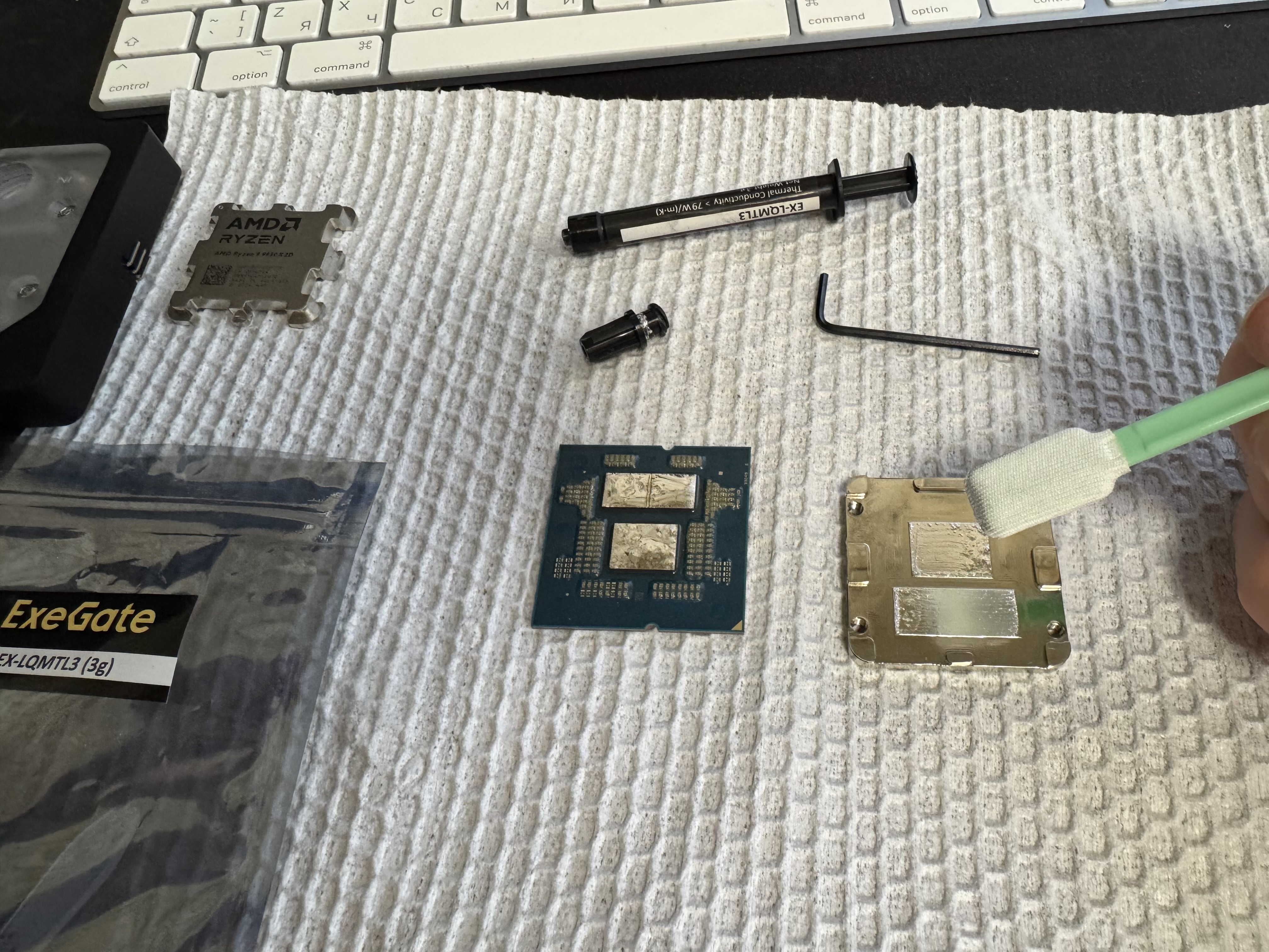 Теплопроводность меди 400 Вт/м что в 5 раз выше ЖМ. Между прочим толстая крышка распределяет тепло на большую площадь. Тут не только одни минусы в ней. Так что да, площадь поверхности кристалла - это основная причина. С 9950Х значительно больше можно отвести с той же системой охлаждения.