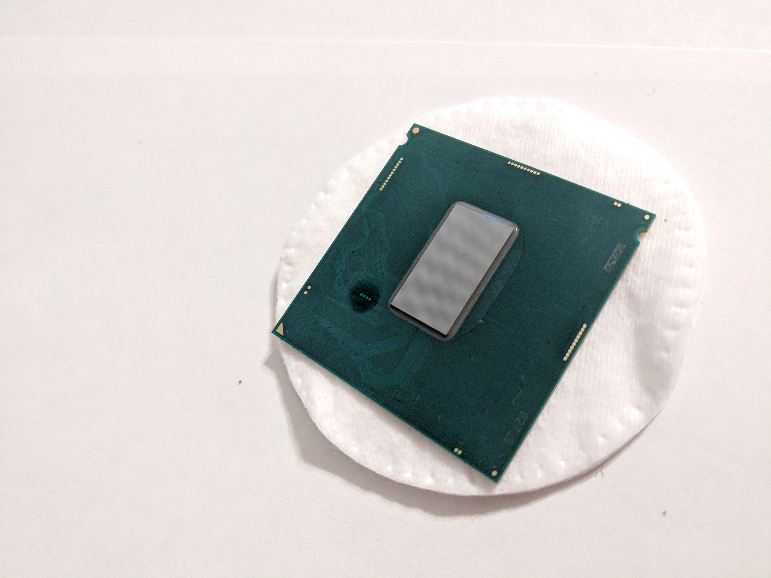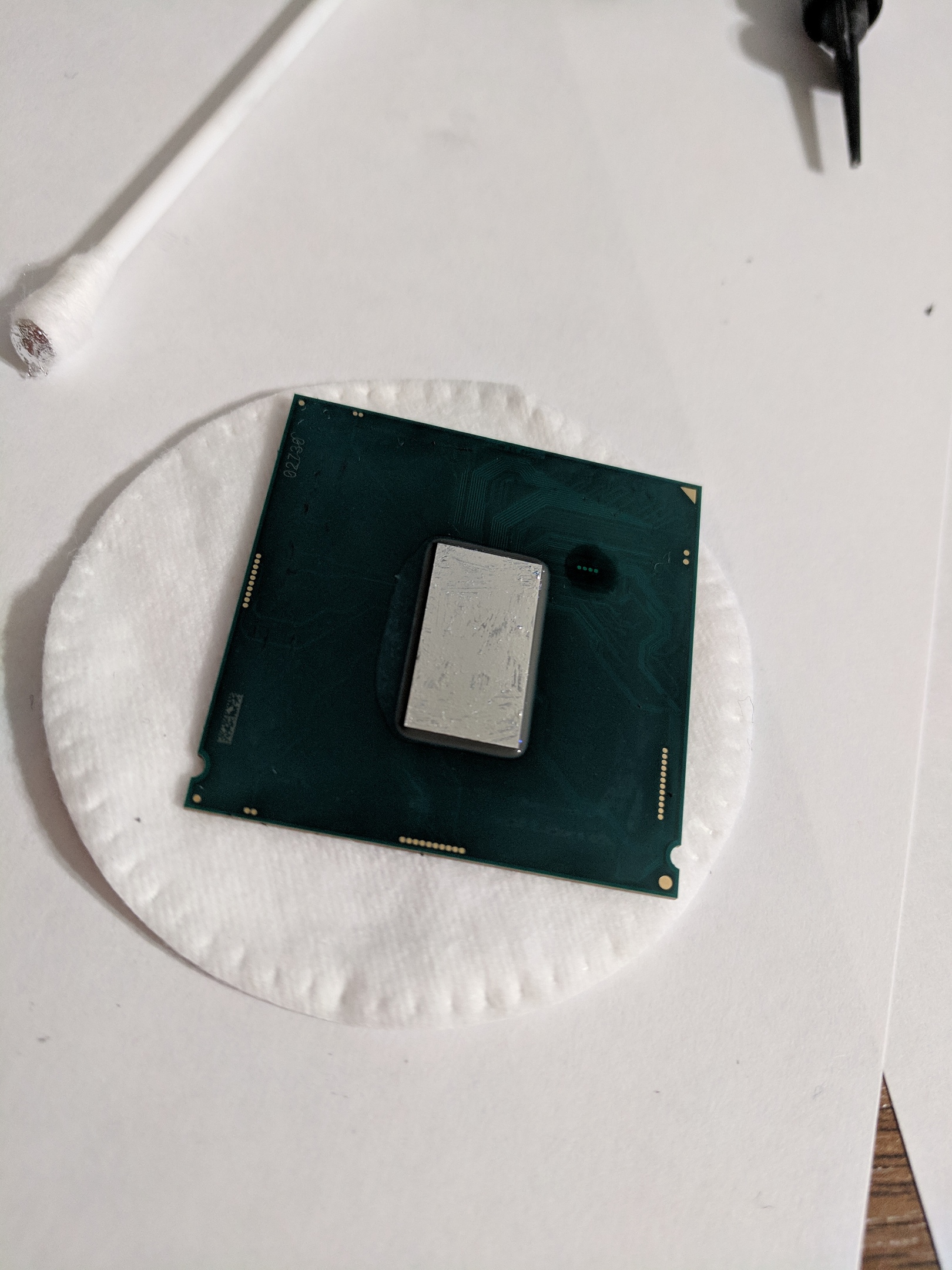 точно. скальпировал методом сдвига, после очистки от клея проверил плату - никаких визуальных повреждений. Сначала подумал, может ножки подогнул, так они в сокете, а не на проце.