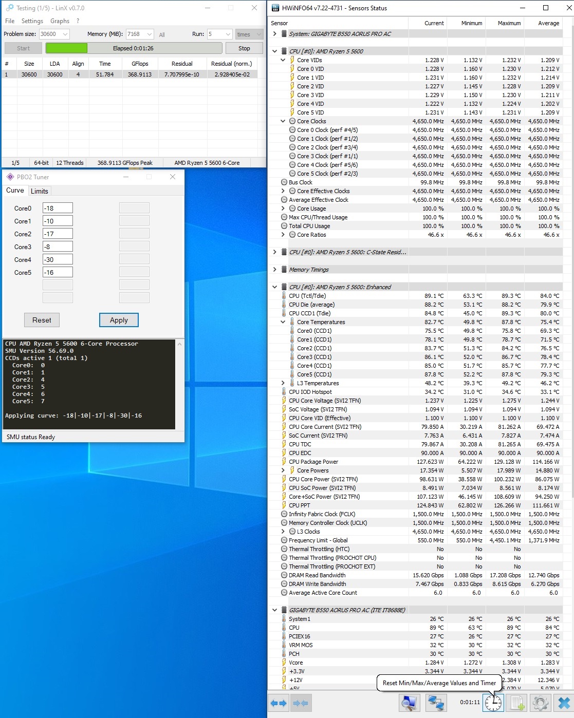 Не берусь интерпретировать. Прошу прощения у перфекционистов, за то что в курве напруге не 100% выровнены, все с 1го приближения выставлялось. 1,298в выставлено в БИОС, фикс 4,65, все остальные напряжения и и настройки авто (в том числе LLC). Стата сброшена в начале 1го прогона (ориентировался по температуре) и заскринена во время 2го во всех случаях. Хотел затестить 4,7 на 1,310в (на 1,298в падает на 3-5 прогоне), но стало страшно от 93 градусов (читы с открыванием окон и/или выносом системника на балкон решил не включать) и почти 1,5в VID на 4ое ядро. Пользуясь случаем хочу задать вопрос знатокам, когда речь заходит о без/опасном напряжение - это какой показатель в мониторинге?