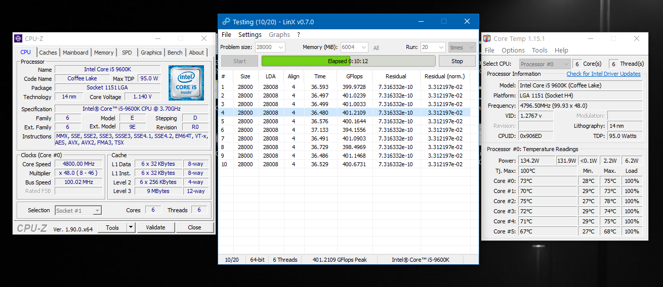 Полученный результат должен иметь следующий вид: Скриншот рабочего стола после прохождения >9 циклов (т.е. между 9 и 10 проходами). Вместе с LinX на рабочем столе должны быть развернуты CPU-Z (первая вкладка) и Core Temp, это обязательный минимум. Такой набор программ даст информацию о напряжении и температурах под нагрузкой-простоем. По желанию можете добавить другие программы, показывающие дополнительную информацию о вашей системе, например третью вкладку CPU-Z, которая покажет модель материнской платы и версию BIOS. Пример результата разгона: Mad Max, 5100 МГц (AVX 0), i7-8086K, HT-ON, Cache 4700, Vcore=1.36V, Batch L805E123, Gigabyte Z370 Aorus Gaming 7 (bios F6), Be Quiet! Dark Rock Pro 4, ЖМ под HS, Windows 10 Pro 64-bit 1809, LinX 0.9.3 64bit.
