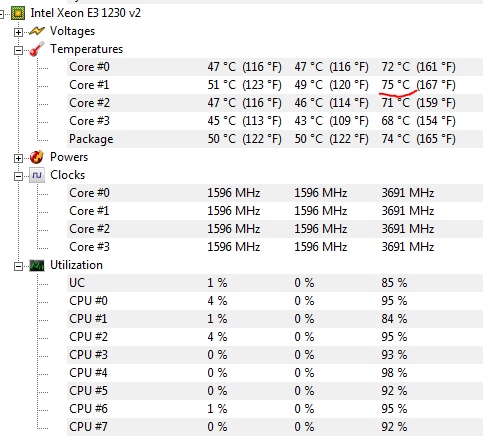 Система профильная. Задался вопросом есть ли смысл скальпировать Intel Xeon E3-1230 v2. В нагрузке с открытой крышкой корпуса процессор греется до 74-75 градусов максимум (скрин в приложении), с закрытой - доходит 88 градусов (причём тестировал с двумя разными кулерами, заметил разницу в 2-3 градуса только с открытой крышкой корпуса). Постоянно сильнее всех греется второе ядро (на 3-5 градусов больше).