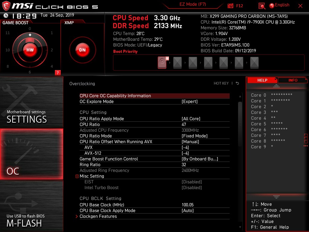 На новых биосах Мси появились инетресные функции, видимо готовятся к новым процам. Так же значительно ускорен POST до загрузки винды. но микрокод для процев модели 654 (7900х ) микрокод 64, который знатно садит производительность: у меня минус 50\100 очков в CB. биос новый поставил, но микрокод вернул 60-й