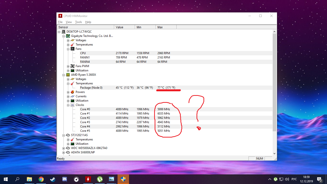 Всем привет. ребят ситуация следующая, hwmonitor показывает следующие неадекватные цифры, и температура проца это норм? собственно в чем может быть проблема, конфиг: 2600x box кулер, b450-aorus M, RAM: hyperX 2666mhz, продуваемый корпус, биос f41, без разгона биос стандартный