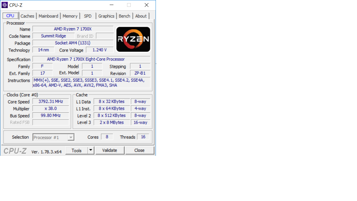 - Обычно поставляется в небольшой коробке без СО. - Штатно имеет базовую частоту 3.6ГГц, частоту 3.7ГГц (технология Turbo Boost) при обычной многопоточной нагрузке (Blender n-cores render) и 4.1ГГц (технологии Precision Boost и XFR) при однопоточной нагрузке (Cinebench R15 single core). - Штатное напржение питания 1.35В. Может возрастать до 1.45В на отдельных ядрах во время работы Precision Boost и XFR. - Энергоэффективность средняя, требования к СО (TDP) - 95W. Энергопотребление порядка 12Вт в простое и 137Вт в обычной многопоточной нагрузке (Blender n-cores render). - По сравнению с R7 1700 имеет увеличенный промежуток XFR (100МГц вместо 50МГц), а также увеличенные технологией SenseMI показатели температуры на 20 градусов (например, 90 при реальных 70).