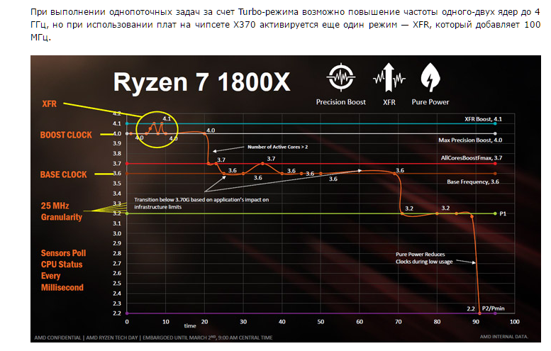 Базовая - заявленная минимальная частота при нагрузке Типичная - частота обычно наблюдаемая при нагрузке на несколько ядер Турбо - заявленная частота при нагрузке на одно ядро XFR - частота обычно наблюдаемая при нагрузке на одно ядро