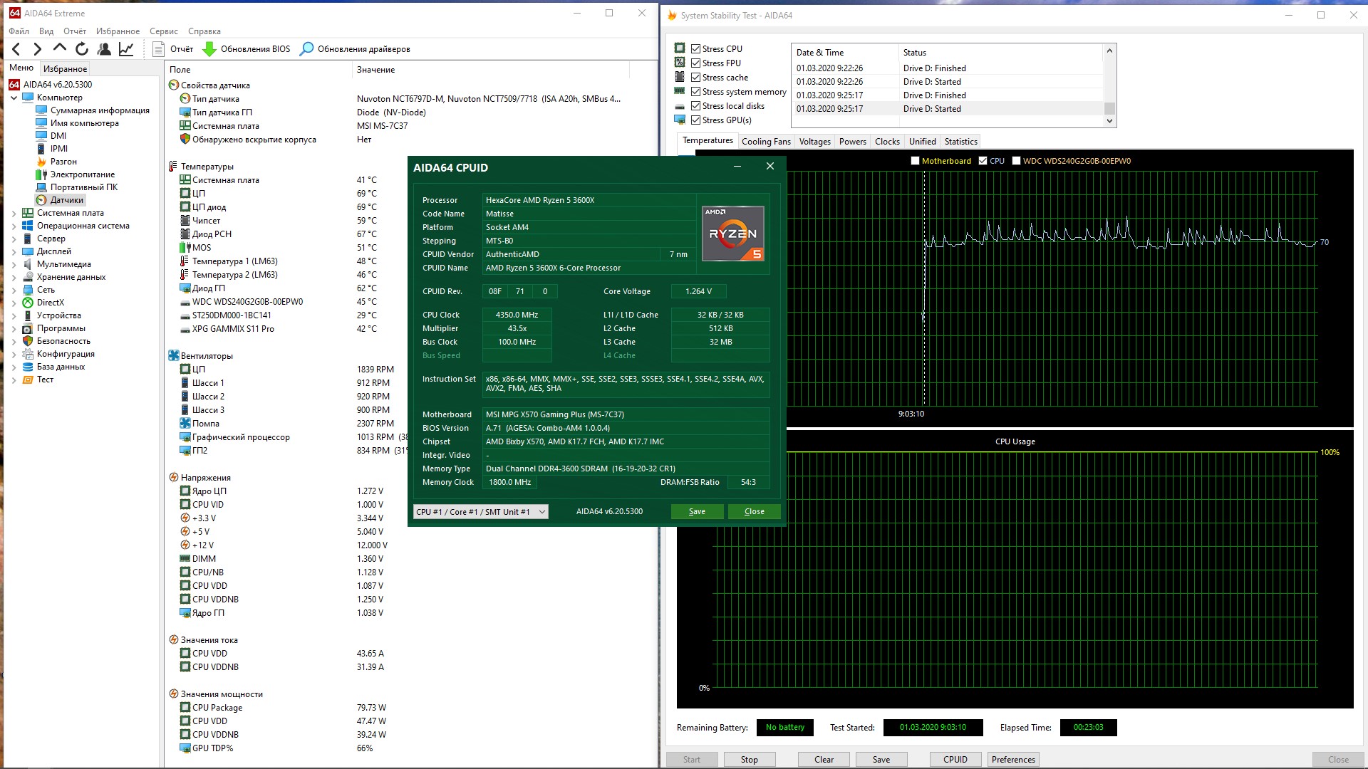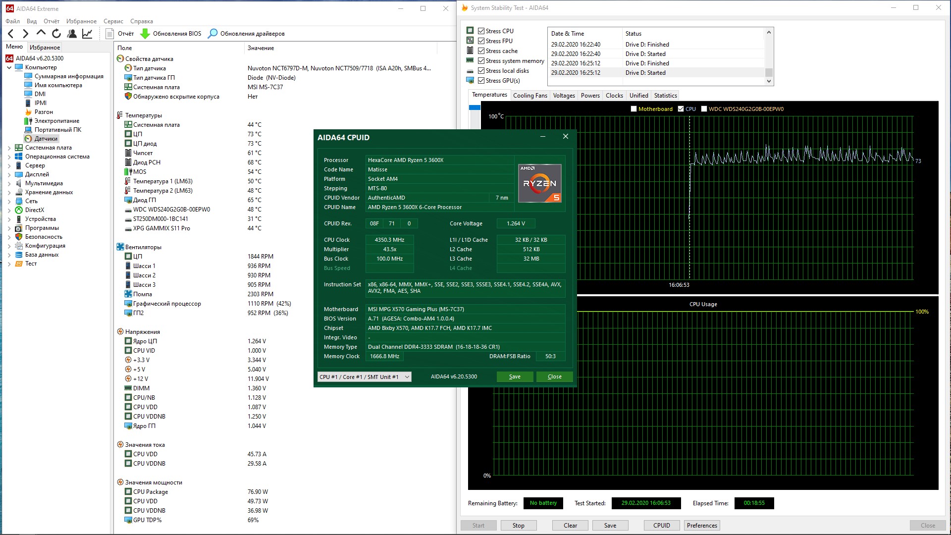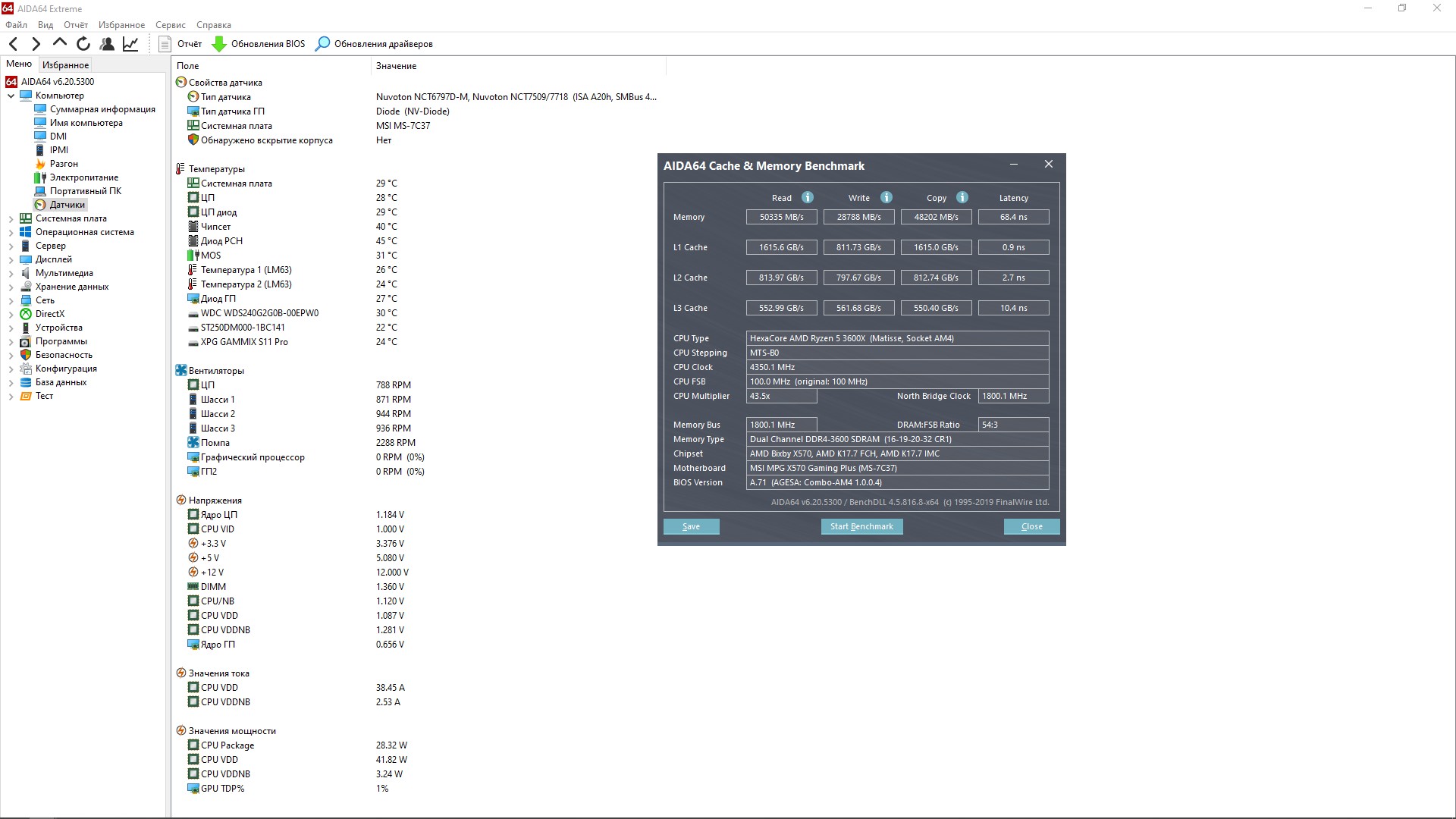 Память разогнал с 3333mhz(16-18-18-36CR-1) до 3600mhz(16-19-20-32CR-1) 1.36v на скринах видно температуру. Процессор разогнал с 3800mhz(сток) до 4350mhz(4400 не хочет брать не как, после 10 минут стрес теста в аиде синий экран, с вольтажом эксперименты, никакой пользы не принесли, х.з. что не так)1.28v на скринах видно температуру.