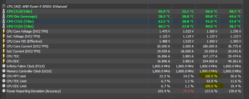 При этом методе игнорируется лимит EDC, лимит TDC настраивается исходя из возможностей VRM, какой ток в амперах материнская плата может максимально выдать не перегревая VRM, лимит PPT это максимальное потребление процессора, особенно актуально если система охлаждения очень инертная. 5900X/5950X упрутся в температурный лимит в 90°С на самом горячем CCD, 5600X/5800X в 95°С, эти значения можно уменьшить при помощи настройки Platform Thermal Throttle Limit. Последние 5°С до этого лимита дают приличные пенальти к бусту.