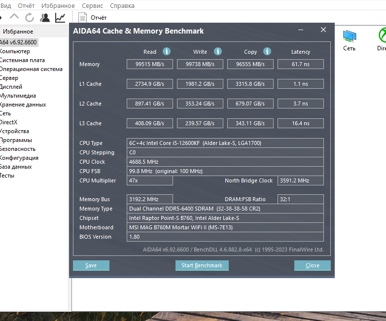 Тест кеша и памяти (память пока на дефолтных 4000 мгц, 4 планки, разгонять ещё не пробовал, но понятное дело, что имеет смысл хотя бы 4800 взять попытаться, тем более что контроллер памяти у нового проца явно лучше, чем у старого) :