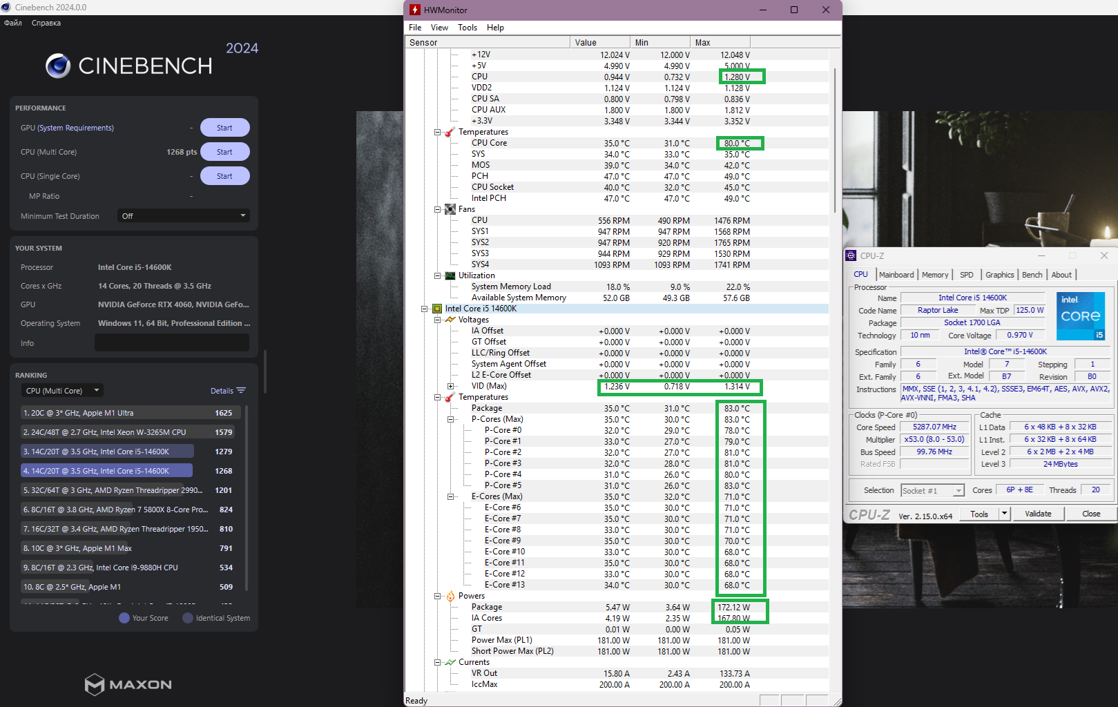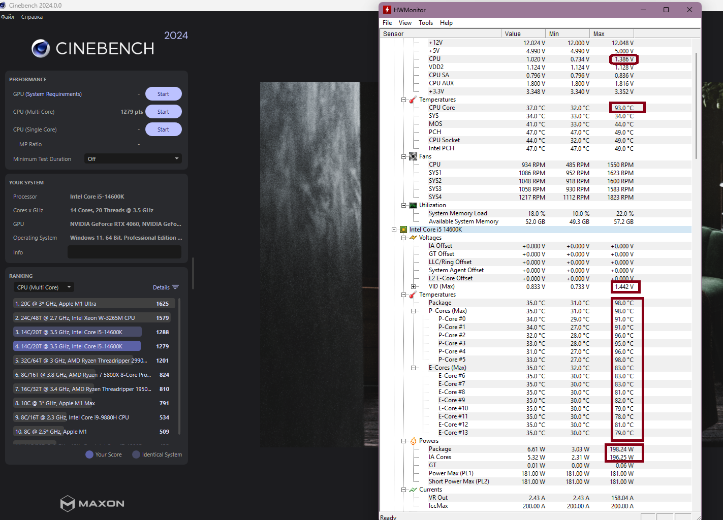 Скрин температур при всех дефолтных параметрах в БИОСЕ ниже под спойлером. 200 ватт кушал проц - это норм? 1.386 напруга и VID до 1.442 многовато, не считаете? 1279 попугаев в Cinebench 2024 - вроде как маловато для этого камня, не?
