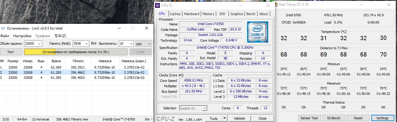 Полученный результат должен иметь следующий вид: Скриншот рабочего стола после прохождения >9 циклов (т.е. между 9 и 10 проходами). Вместе с LinX на рабочем столе должны быть развернуты CPU-Z (первая вкладка) и Core Temp, это обязательный минимум. Такой набор программ даст информацию о напряжении и температурах под нагрузкой-простоем. По желанию можете добавить другие программы, показывающие дополнительную информацию о вашей системе, например третью вкладку CPU-Z, которая покажет модель материнской платы и версию BIOS. Пример результата разгона: Mad Max, 5100 МГц (AVX 0), i7-8086K, HT-ON, Cache 4700, Vcore=1.36V, Batch L805E123, Gigabyte Z370 Aorus Gaming 7 (bios F6), Be Quiet! Dark Rock Pro 4, ЖМ под HS, Windows 10 Pro 64-bit 1809, LinX 0.9.3 64bit.