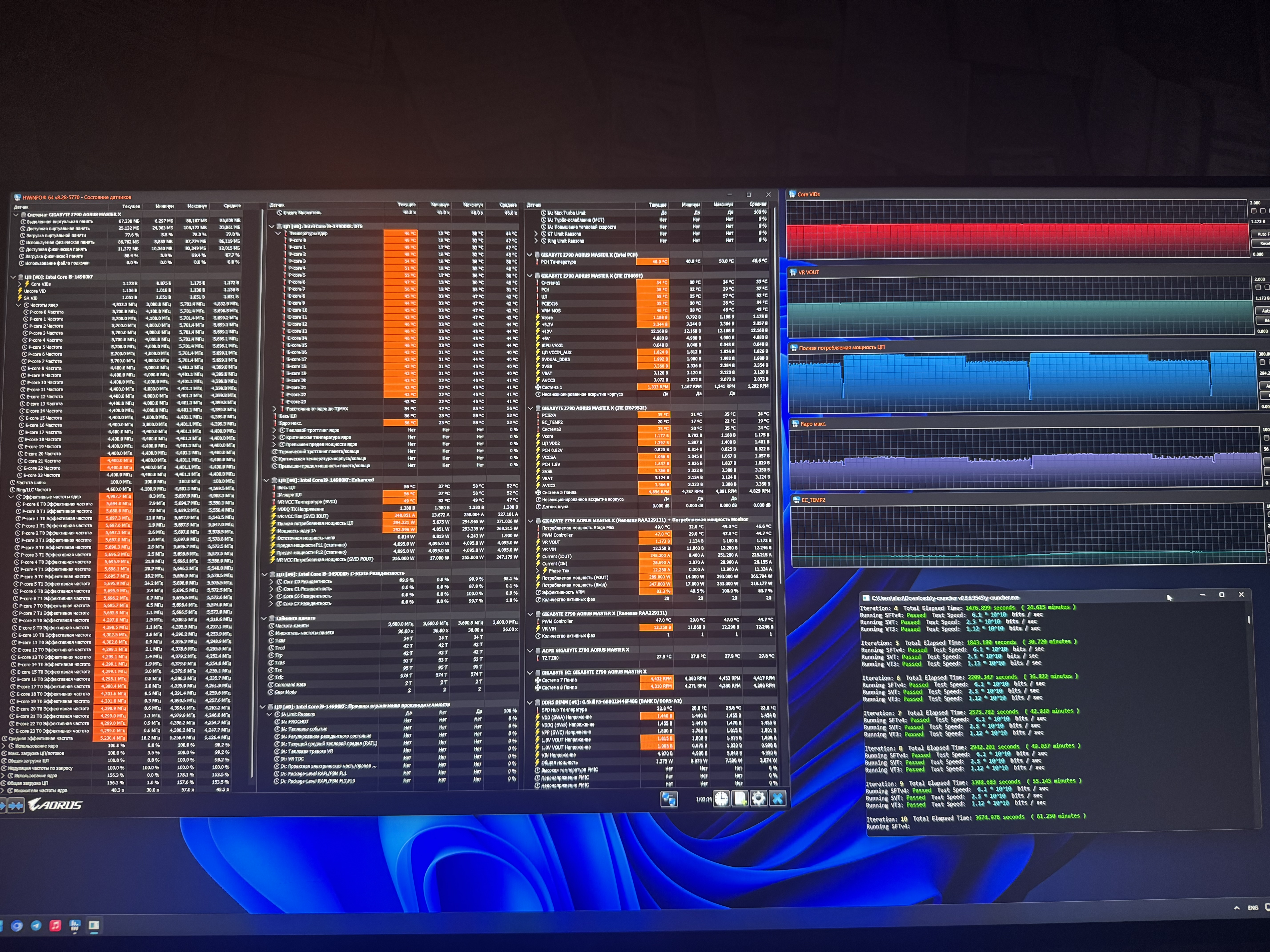 Собственно вот, 14900KF в стоке, с даунвольтом и ультимативно превозмогающим, до смешного избыточным охлаждением