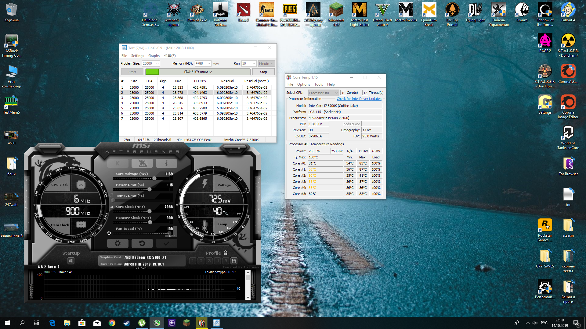 Полученный результат должен иметь следующий вид: Скриншот рабочего стола после прохождения >9 циклов (т.е. между 9 и 10 проходами). Вместе с LinX на рабочем столе должны быть развернуты CPU-Z (первая вкладка) и Core Temp, это обязательный минимум. Такой набор программ даст информацию о напряжении и температурах под нагрузкой-простоем. По желанию можете добавить другие программы, показывающие дополнительную информацию о вашей системе, например третью вкладку CPU-Z, которая покажет модель материнской платы и версию BIOS. Пример результата разгона: Mad Max, 5100 МГц (AVX 0), i7-8086K, HT-ON, Cache 4700, Vcore=1.36V, Batch L805E123, Gigabyte Z370 Aorus Gaming 7 (bios F6), Be Quiet! Dark Rock Pro 4, ЖМ под HS, Windows 10 Pro 64-bit 1809, LinX 0.9.3 64bit.