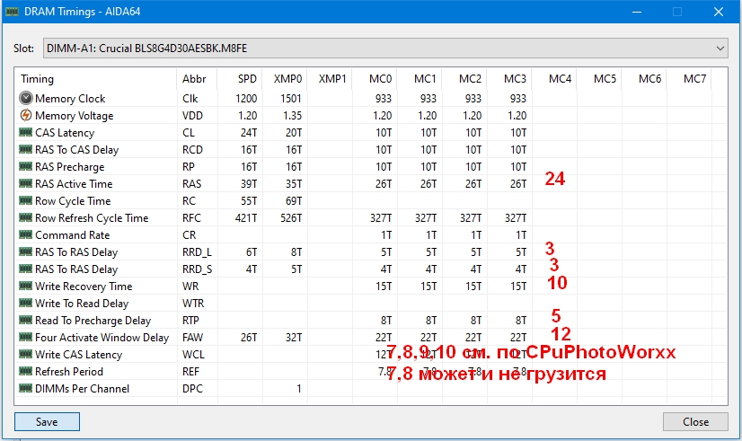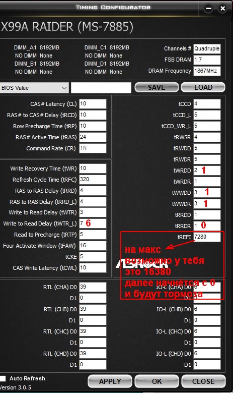 если не можешь поменять RRD_S, то и RRD_L=4 поставь и тогда tFAW=16, +tRFC cделай кратным 8(320 например), + пользуй ASRock Timing Configurator для отображения вместо мемтвик либо и то и то. + границы таймингов в чипсете расширь, чтоб все тайминги влезали, +третички тож могёшь подогнать 1:1↓ + те как вариант на понижение первого тайминга Китайский LGA2011-3 (X99 Huananzhi, Jingsha, Aterminer, PLEXHD) #16829851 есть ли такая проблема на 1866, я не в курсе.