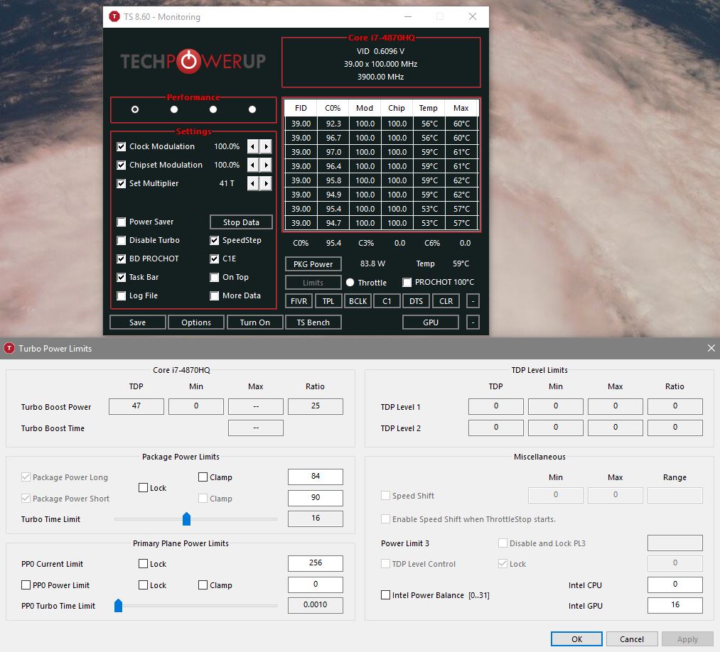 Добавлено спустя 1 минуту 32 секунды: nuclearweapon Только сейчас увидел, что лимит мощности выставлен в 84 W. И на скриншоте ThrottleStop именно это величина и достигнута...
