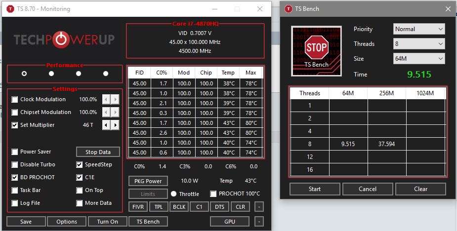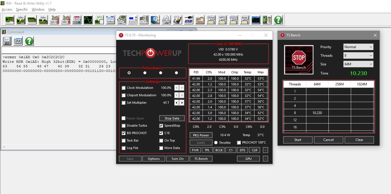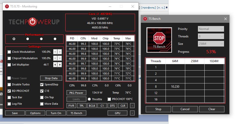 nuclearweapon Я все жду скриншот ThrottleStop нужен при выполнении TS Bench после команды wrmsr 0x1AD 0x0 0x2C2C2C2C P.S. Перед запуском ThrottleStop надо удалить ini-файл и ничего больше в нем не настраивать.