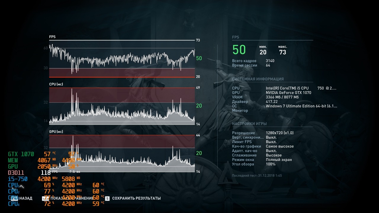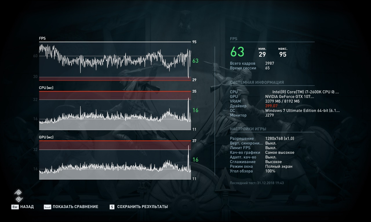Конечно. 1280х768, всё как на скрине выше. Я тоже ожидал несколько иных результатов, но нет Я сильно подозреваю, что с этой игрой не всё ок. Может быть там патчи какие-то нужны(с торентов качал - Assassin's Creed: Odyssey - Ultimate Edition [RePack] [RUS + ENG + 13 / RUS + ENG] (2018) (1.0.6 + DLCs)), может этот баг с быстрыми дисками как-то влияет, у меря раид0 из 4 ссд. Скачал, сделал замеры и удалил. Итоговый результат тот же, но минимальный и максимальный фпс сильно отличались в большую сторону. Есть, конечно, небольшой шанс, что я вообще не ту игру смотрел, но картинка была очень похожа на скрины выше