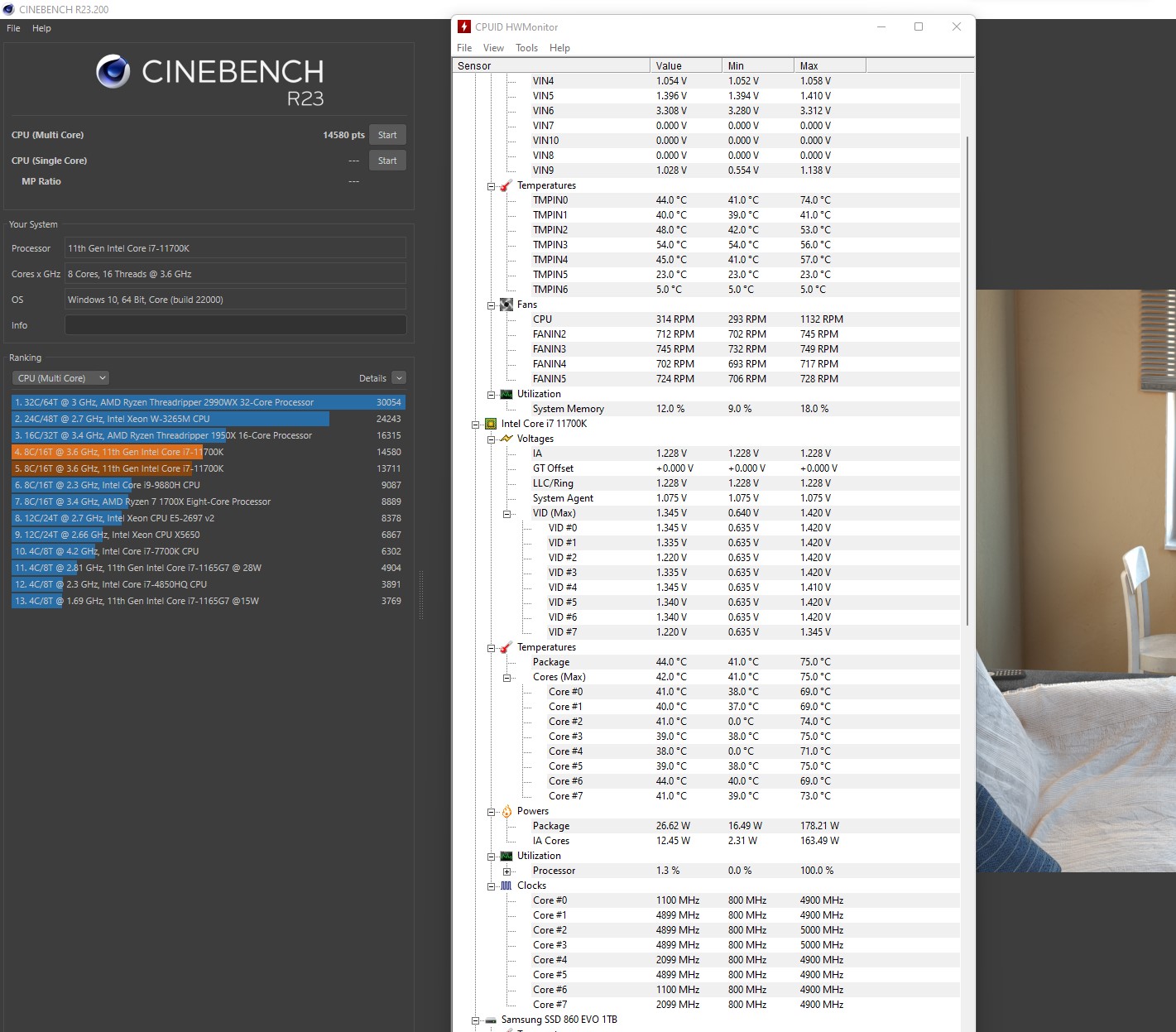 Призываю к коллективному разуму. Я уже больше месяца пытаюсь понять что произошло с производительностью CPU, просела примерно на 10%, биосы разные шил, винду(10-ю,11-ю) раз 10 переставлял, при одинаковых настройках биос, в LinX 0.9.11 раньше всегда было в районе 540 гигафлопс, теперь 500. В других тестах CinebenchR23, 3DMark Time Spy тоже видно эти 10% просадки. Самое интересное иногда система выдаёт положенные баллы в тестах, но никаких закономерностей я не заметил, 99% времени результаты ниже положенных что были раньше(скрины есть старые). Как бенчить я прекрасно знаю, после загрузки подождать 2-3 минуты пока процессы устаканятся. Куда копать и как исправить, непонятно.