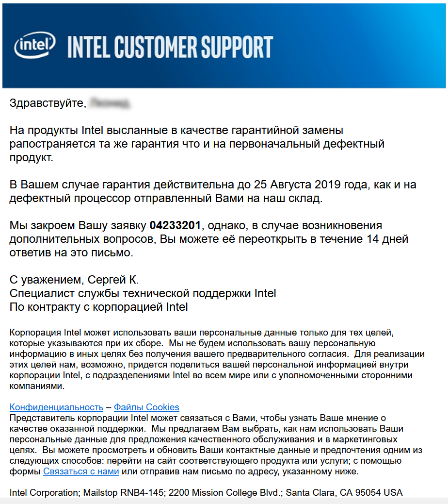 Компания признала, что в 2017 году предоставила процессор с данными S/N (с которыми я и обратился к ним на сегодня). Но тем не менее, они упорно продолжают утверждать, что процессор поддельный.