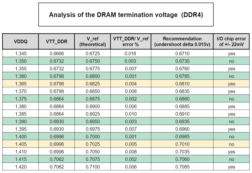 Итого что мы имеем : зеленым я выделил благоприятные вольтажи на которых не будет ошибок. Желтым - спорный вариант. Хочу обратить Ваше внимание что процент отклонения реального напряжения от теоретического VTT_DDR даже на милливольт имеет шанс повлиять на стабильности системы. Мы имеем дело с наносекундами и самодостаточной системой где все вольтажи и тайминги в совокупности создают синергизм.