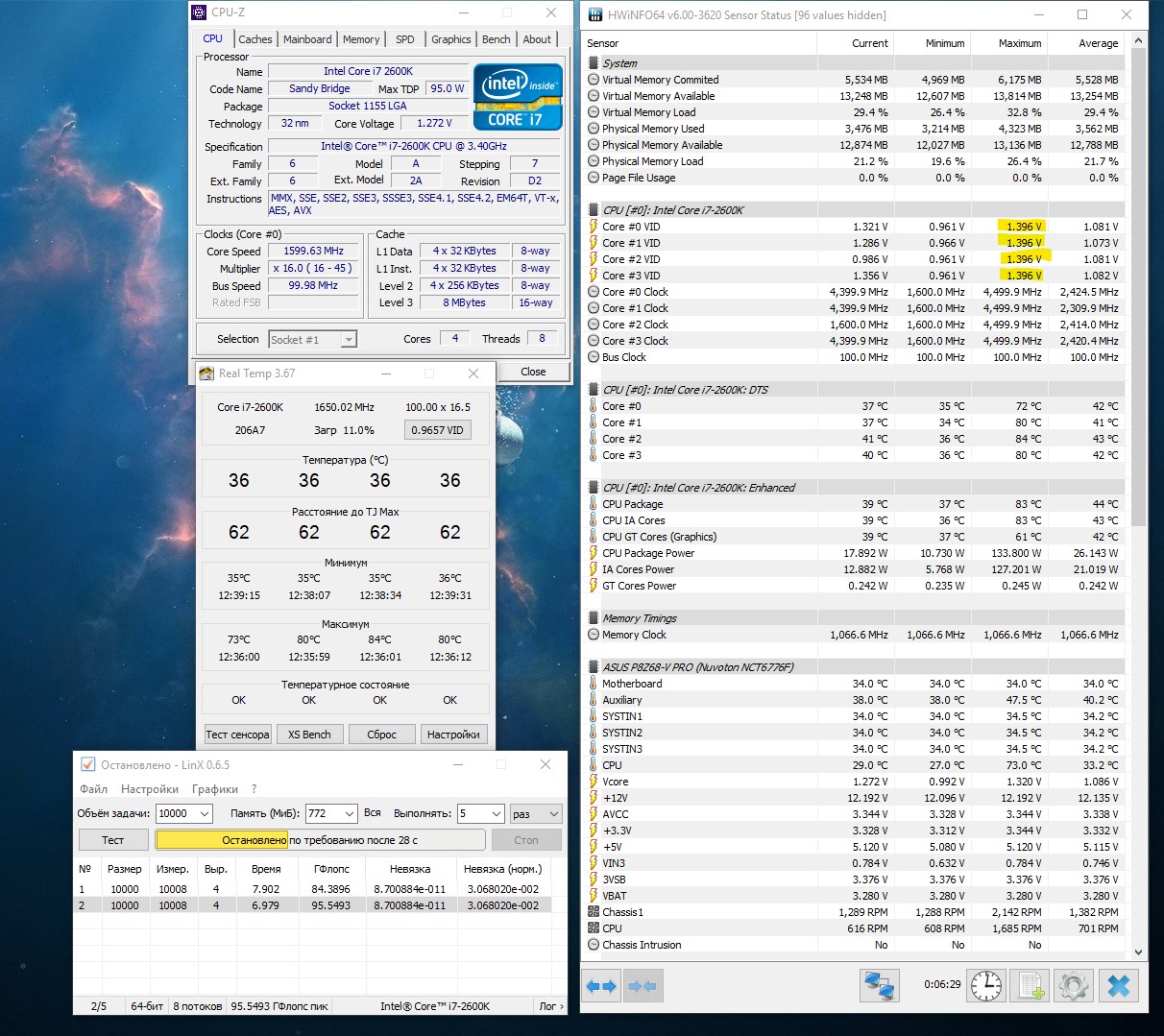 Товарищи, помогите, пожалуйста, с разгоном i7-2600K на плате Asus P8Z68-V Pro. Выставил такие значения: