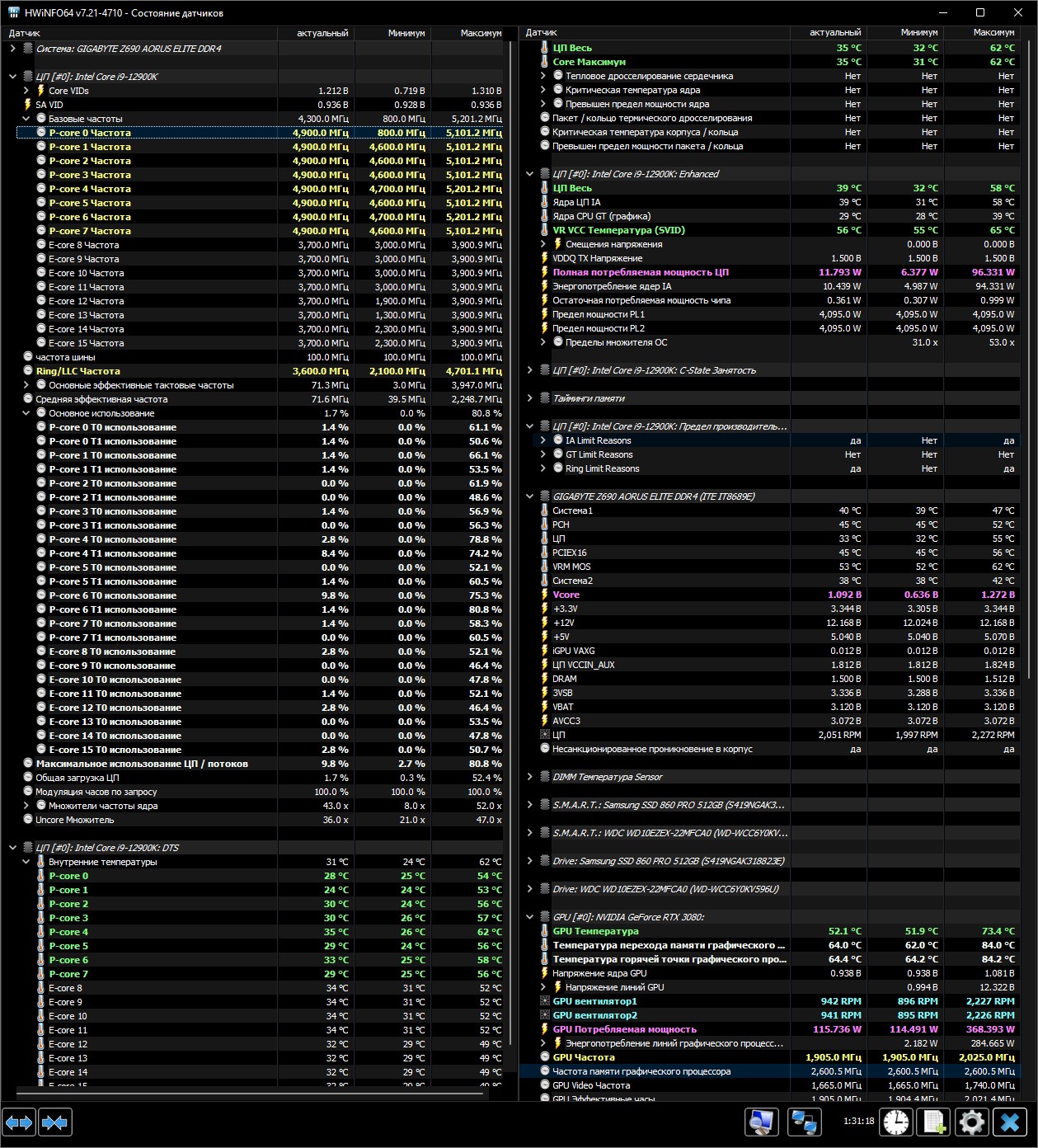 Подскажите пожалуйста, не встретил информации по этому вопросу: Мама Aorus Z690 Elite DDR4, проц 12900К, биос в стоке, только XMP (без XMP тоже самое), RTX 3080, БП Corsair 1000 голд, Win 11 в макс производительности, последние обновы. Проц по одному (первому ядру) находясь в простое скидывает частоту на доли секунды до 800 Мгц, все остальные ядра держат не менее 4600. При этом при нагрузках и прохождении стресс тестов все нормально, турбо частота держится стабильно. Все тесты проходятся, температуры в норме. Так же если выставить напряжение и множители с отключением повер лимитов, так же первое ядро сбрасывается, но уже не до 800 Мгц, а до 2600, когда все остальные держат выставленный множитель. Это является нормальным для него (процессора этого) или же какой то проблемой на моей стороне? Я нубик и перешел с калькулятора поэтому прошу совета у более опытных/осведомленных, помогите пожалуйста советом/мнением куда копать. ПС: скрин со стока.