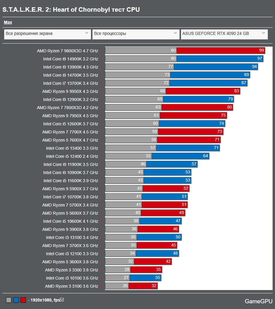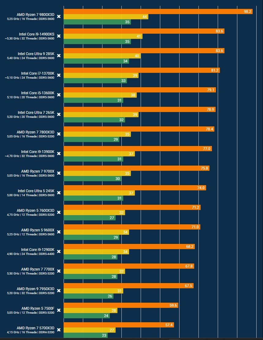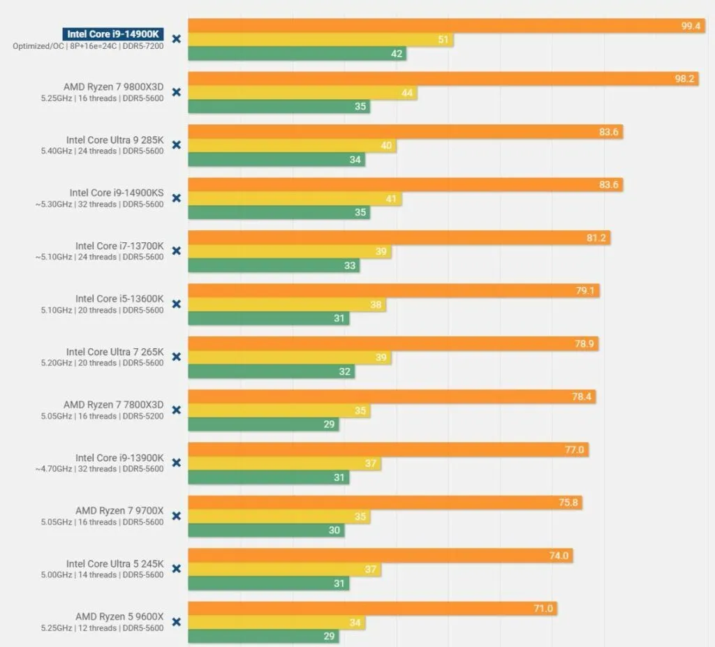 В этом ничего сложного нет, если не обращать внимание, что тебе придется обработать пару тонн информации, как это сделал я за последние 2 недели в поисках платформы для 2-го Сталкера, сопоставляя кучу разной информации из разных источников. В общем, 1. 9800x3d (недостижим за счёт разгона 300-500 МГц). 2. 285к, при условии удачности контроллера и памяти для него по цене золота. Разница между ними в районе 10%. 3. 14900k. 4. 7800x3d. Но лидером будет 9950x3d.