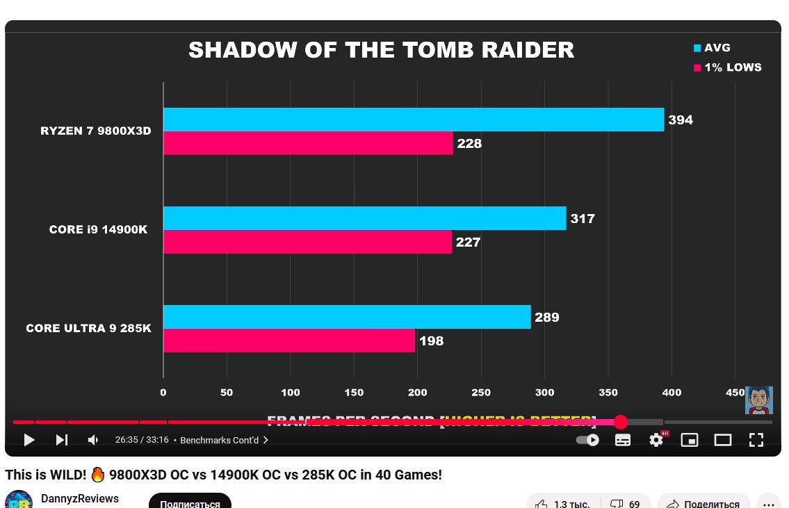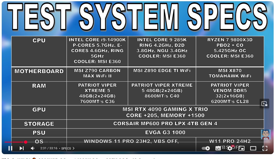 Про "разгон" 285K ничего сказать не могу, про 14900K - чувак почему-то погнал ненужные Е-ядра до 4,6, Р оставил в стоке (5,7), память тоже в xmp, правда хорошем - 7600, но по очередному совпадению* 9800X3D повезло больше - 6200 cl28 это практически максимум (дальше уже хардкор с хорошим охладом и напругой vdd>1,6v)... Ну ок, пускай лучший в мире игровой проц имеет небольшую фору, я не против, но черт возьми что это такое?!