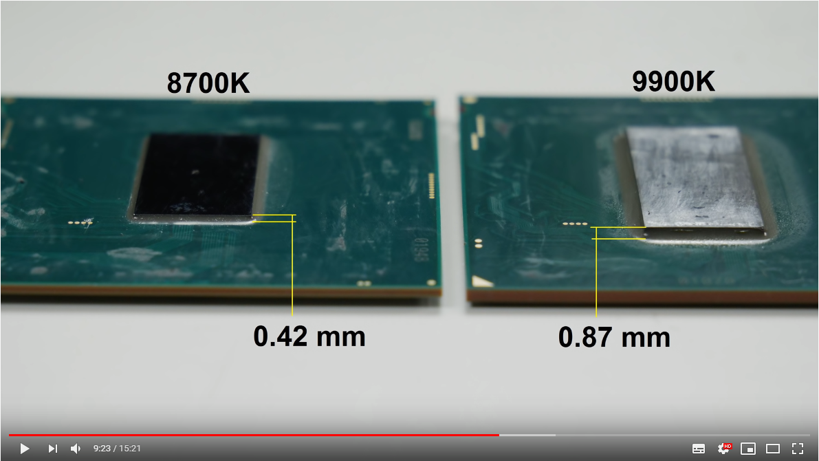 TyPuCToZ В том-то и дело, что Der8auer не учитывает, что кристалл помимо индия покрыт ещё и компаундом. То что он счистил индий, не значит что он добрался до кремния. Там же, по ходу ролика, он сравнивает толщину подложки и кристаллов 8700К и 9900К, и хорошо видно что с 9900К счищен не весь индий, не то что до лака добрался как у 8700К. При этом, он развивает идею, что дополнительные градусы относительно 8700К даёт более толстый кристалл. Ну так сточил бы его до толщины 8700К, и убедился в этом. А так он сточил сначала остатки индия и слой компаунда - получил минус 4 градуса. Далее сточил 50 микрон кремния - получил минус 1 градус. Толщина кремния при этом у 9900К осталась всё равно больше чем у 8700К.