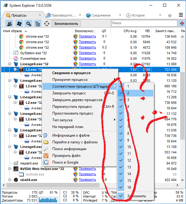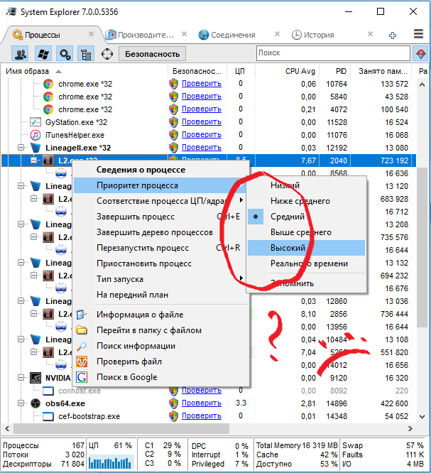 посоны, не могу поменять приоритет в программе System Explorer у приложения и так же не могу распределить ядра на конкретное приложение. В диспетчере устройство пишет, что отказано в доступе, хотя открывал с правами и администратора. И приложение System Explorer тоже запускаю с правами админа. Не помогает. Приложение защищается Защитой Frost (на третьем фото обозначил его) Возможно оно не дает регулировать. Как отрегулировать приоритет и задать отдельное ядро на отдельный клиент игры?
