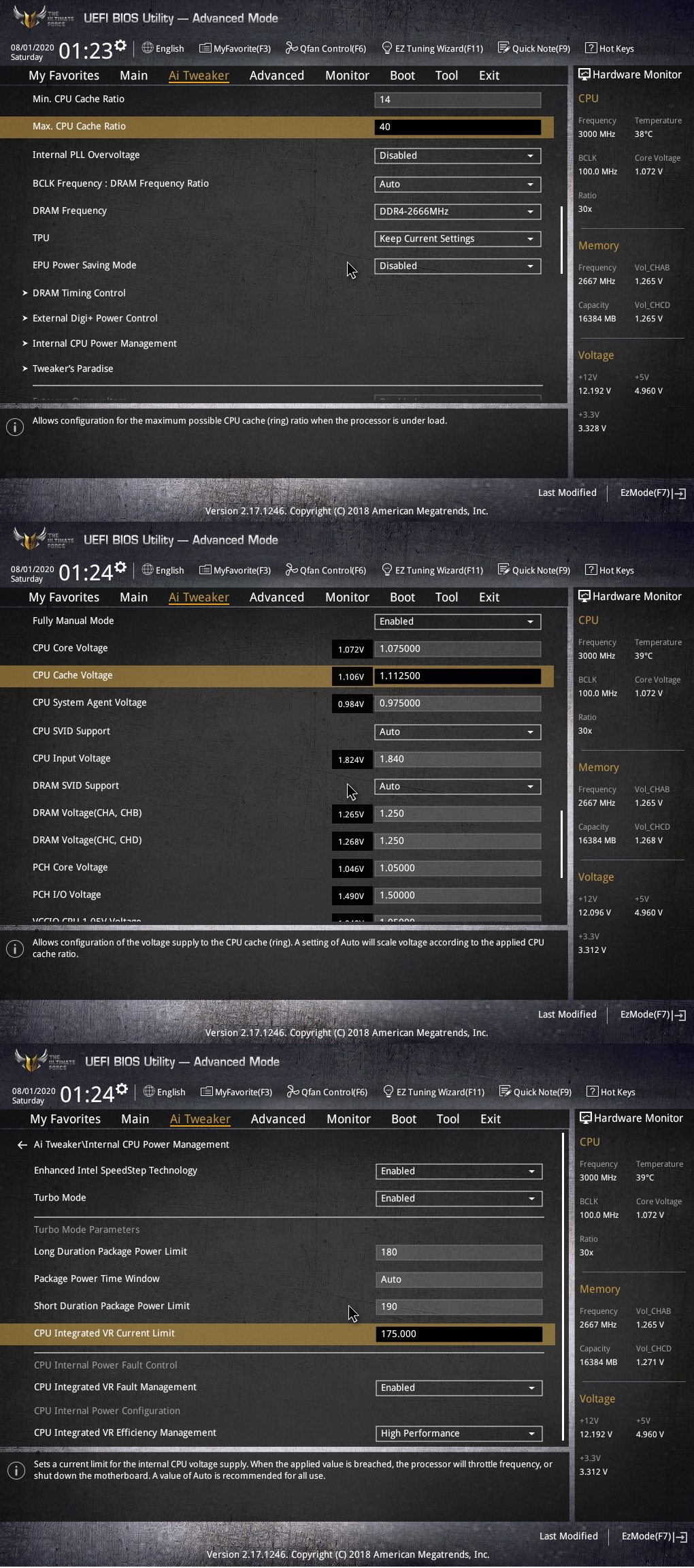 Состояние на сегодня: - напряжение по ядрам для 4,0 скорректировал до 1,075v; - взял стабильные 4,0 по кэшу при напряжении 1,1125v; - частоту памяти установил в 2666 при 1,25v (можно и больше, запас есть); - пришлось увеличить параметр "ограничение тока процессора/CPU Current Limit" до 175А; - максимально зафиксированные температуры по ядрам = 66гр; - максимально зафиксированный TDP = 170W.
