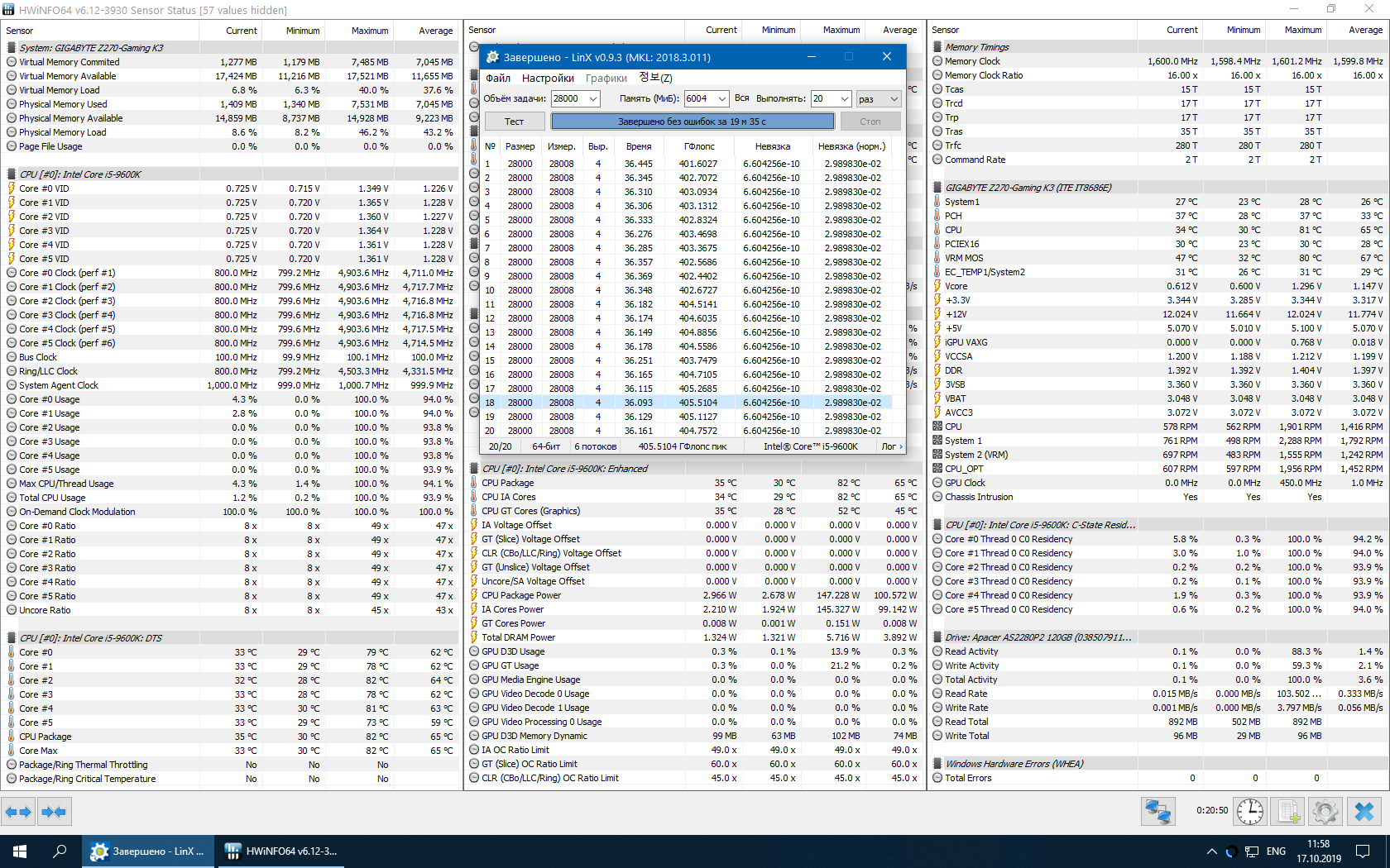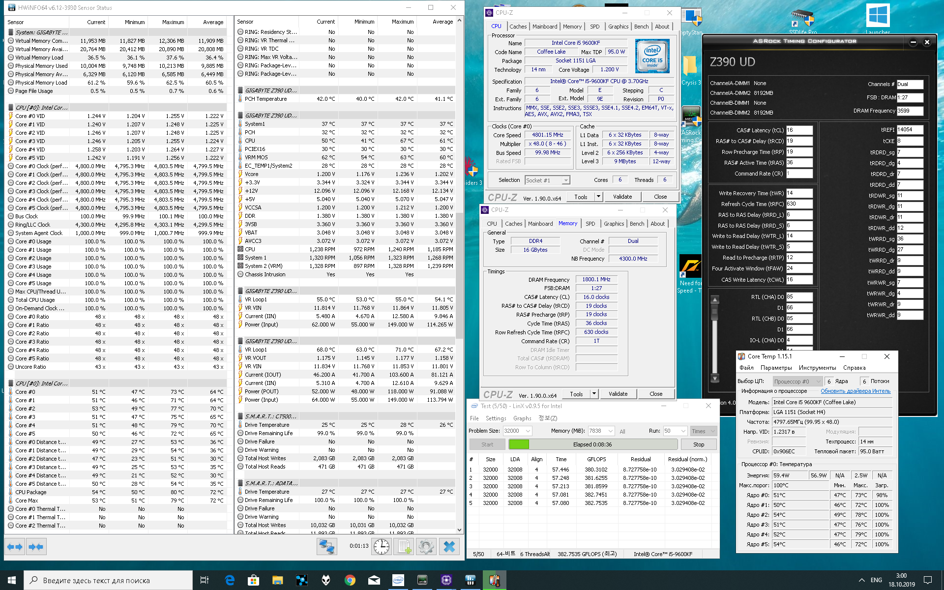 Полученный результат должен иметь следующий вид: Скриншот рабочего стола после прохождения >9 циклов (т.е. между 9 и 10 проходами). Вместе с LinX на рабочем столе должны быть развернуты CPU-Z (первая вкладка) и Core Temp, это обязательный минимум. Такой набор программ даст информацию о напряжении и температурах под нагрузкой-простоем. По желанию можете добавить другие программы, показывающие дополнительную информацию о вашей системе, например третью вкладку CPU-Z, которая покажет модель материнской платы и версию BIOS. Пример результата разгона: Mad Max, 5100 МГц (AVX 0), i7-8086K, HT-ON, Cache 4700, Vcore=1.36V, Batch L805E123, Gigabyte Z370 Aorus Gaming 7 (bios F6), Be Quiet! Dark Rock Pro 4, ЖМ под HS, Windows 10 Pro 64-bit 1809, LinX 0.9.3 64bit.