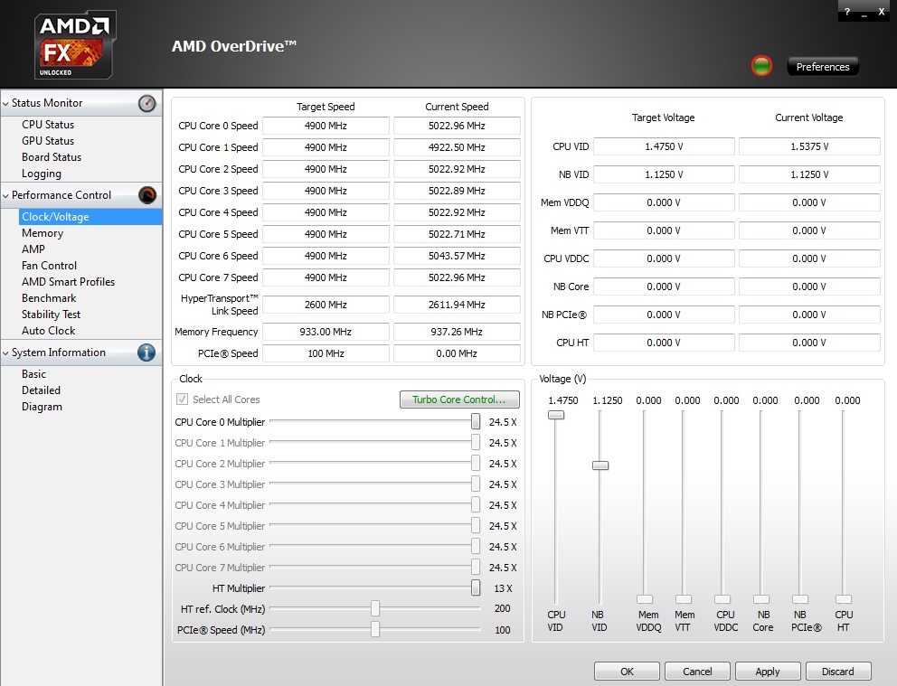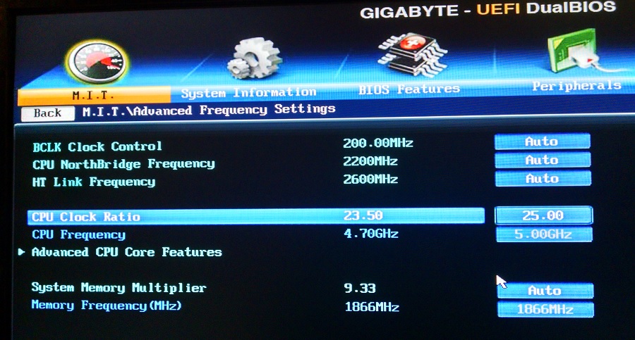 Всем привет! Прикупил процессор AMD FX-9590 BOX Black Edition + охлаждение для него Thermaltake NiC C5. Все это стоит на матери GigaByte GA-990FXA-UD3 rev4.0 с последней официальной прошивкой F3 и поддержкой данного процессора. Собственно вопрос о разгоне: Не могу поднять частоту множителем, биос сразу ругается, хотя до этого стоял феном 2 и гнался прекрасно без всяких ограничений матерью. При попытке разгона шиной + поднятия напряжения мать не ругается, но при этом дальше логотипа винда не грузится. Программой AMD OverDrive через винду разгон осуществляется и работает, но под полной нагрузкой программы LinX система виснет, температура выше 55 не поднимается. В матери никаких настроек касаемо APM Master Mode, HPC Mode и Cool'n'Quiet нет. Что я делаю не так?
