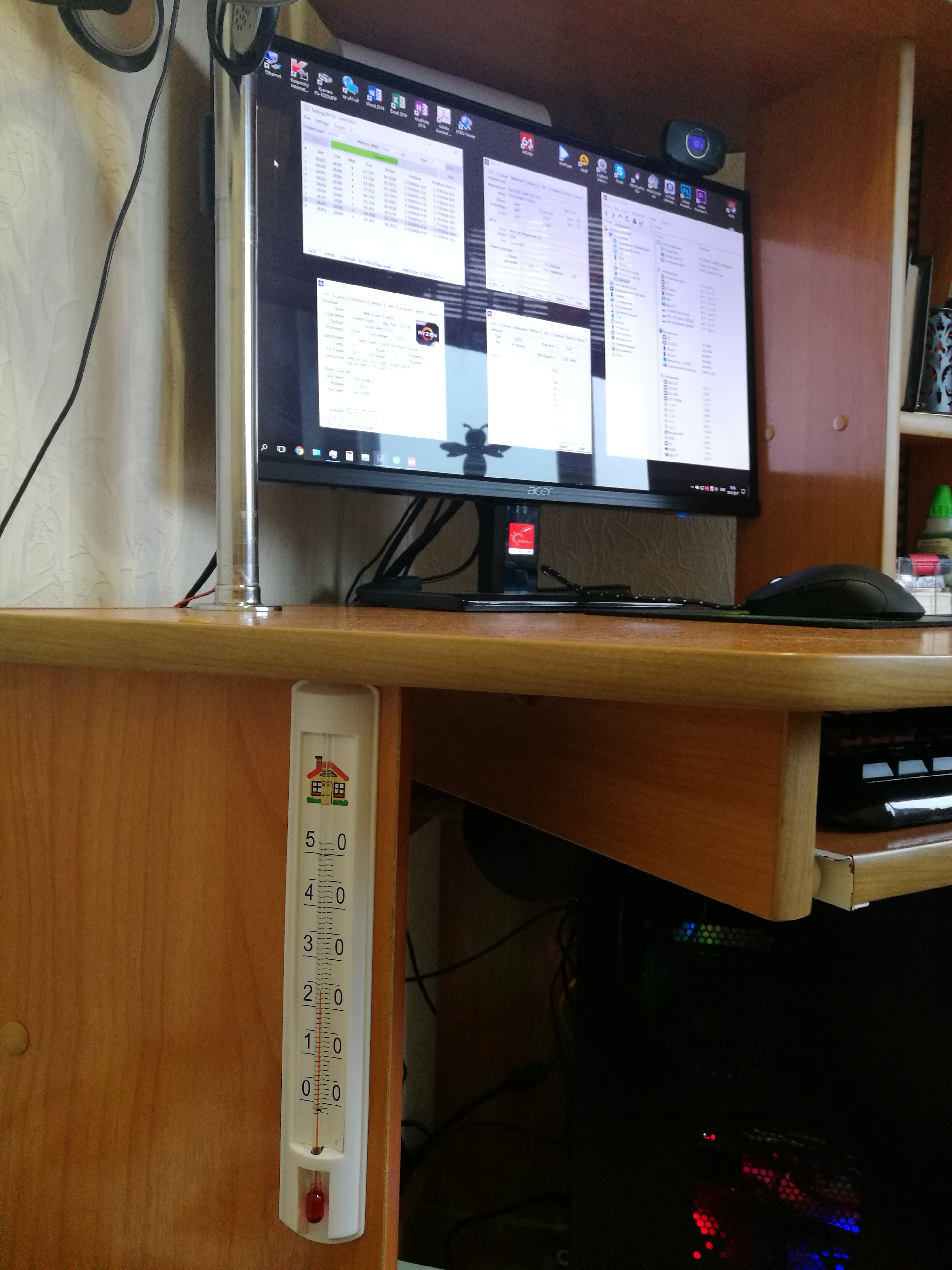 Прям расследование какое то ))). Вот фотография градусника, сделанная во время тестов, и на заднем плане, под столом, видно закрытый корпус системника. Я же говорю, просто попался очень отличный экземпляр процессора.