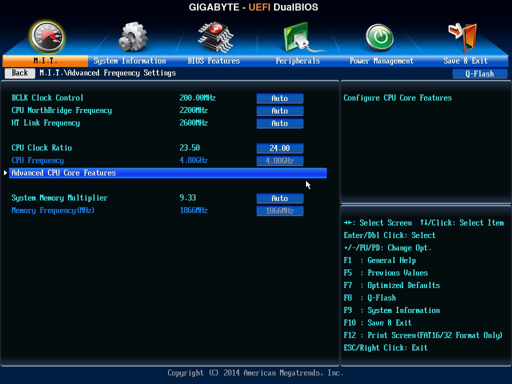 То что мать не давала запуститься с изменением настроек процессора виноват был режим турбо коре, который почему то не бросился мне в глаза. И так вчера мне удалось добиться стабильного разгона до 4800мгц при вольтаже 1.58. Но температура во время стресс тестов не поднималась выше 60град. а если выставить частоту 4900 то тесты уже не проходят. Вопрос к знающим что еще нужно поднять изменить??? Раньше манипулировал только напругой и множителем теперь по видимому придется еще повеселиться, вот скрины биоса: