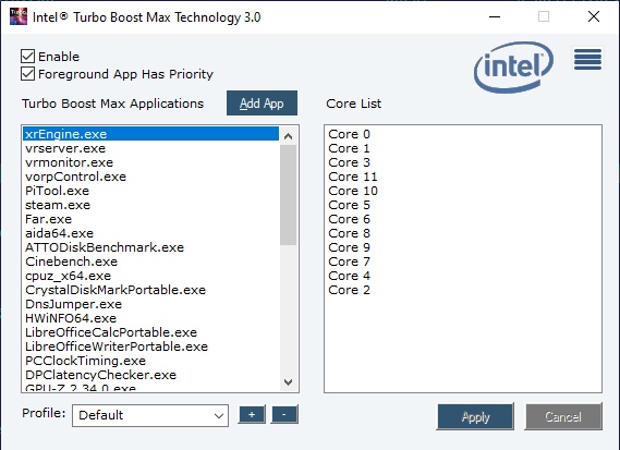When the box to the left of the Affinitize All Demanding Work advanced setting is checked (Intel default), the software takes actions to run the demanding work of all applications on processor cores listed in the Core List in an ordered fashion with the following priority: 1) Foreground Applications (if Foreground App Has Priority control is checked), 2) Applications in the Turbo Boost Max Applications list, 3) Other applications. When the box is un-checked, the software takes actions to run the demanding work of Foreground Applications (if Foreground App Has Priority control is checked), and applications in the Turbo Boost Max Applications list only.
