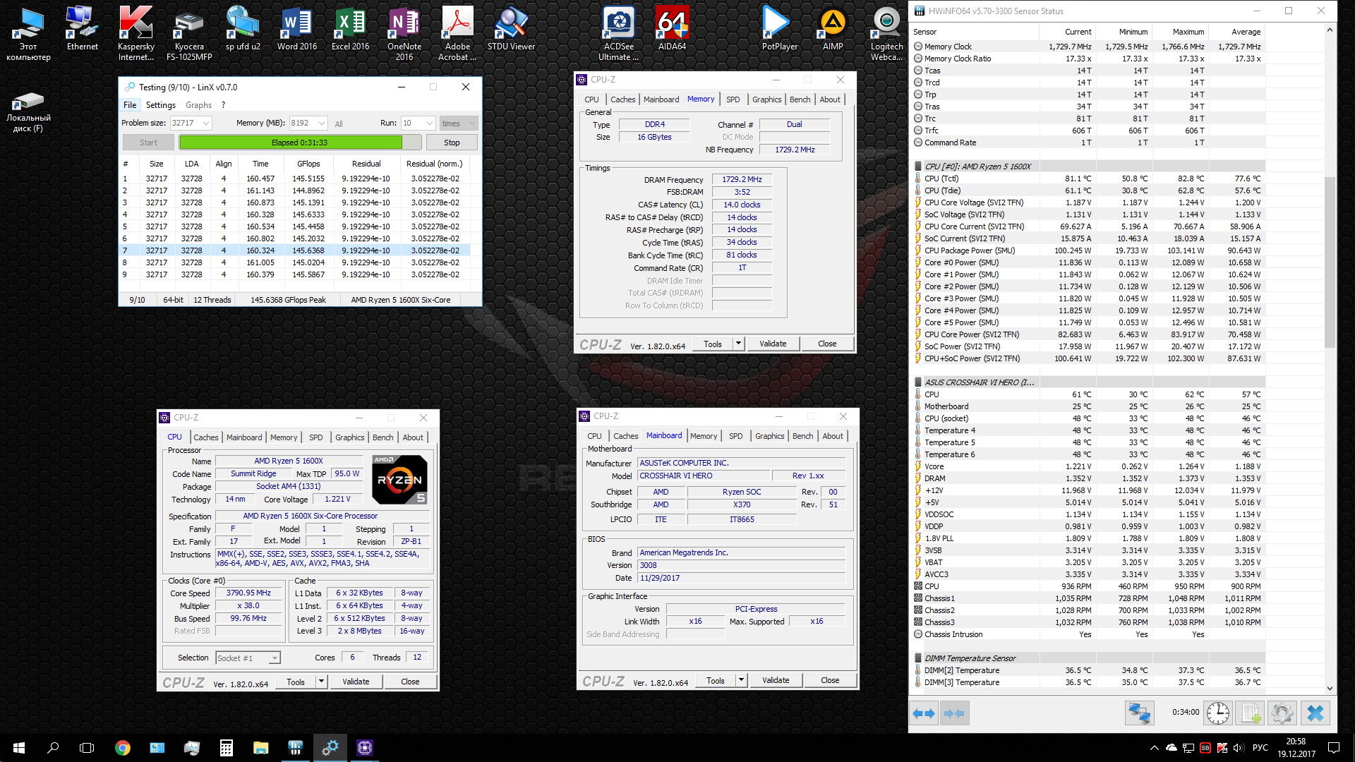 - Обычно поставляется в коробке с системой охлаждения Wraith Spire RGB (это круглая конструкция из целого куска алюминия с медной вставкой-испарительной камерой в основании и вентилятором с кольцом разноцветной подсветки, крепится к задней пластине разъёма AM4 четырьмя винтами). - Штатно имеет базовую частоту 3.0ГГц, частоту 3.2ГГц (технология Turbo Boost) при обычной многопоточной нагрузке (Blender n-cores render) и 3.75ГГц (технологии Precision Boost и XFR) при однопоточной нагрузке (Cinebench R15 single core). - Штатное напряжение питания 1.1875В. Может возрастать до 1.3В на отдельных ядрах во время работы Precision Boost и XFR. - Очень энергоэффективный, требования к СО (TDP) - всего 65W. Энергопотребление порядка 10Вт в простое и 85Вт в обычной многопоточной нагрузке (Blender n-cores render).