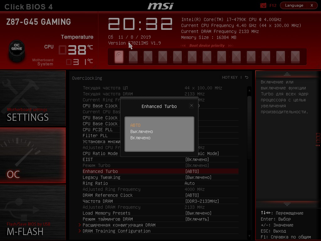 Sultan_SPb для 4.4ггц 1.18в нормально, можно попробовать ниже, но не факт что будет стабильно - от удачности экземпляра зависит. Правда, судя по скрину плата еще завышает вольтаж, может имеет смысл отрегулировать LLC. Вольтаж кеша можно попробовать понизить, т.к. автоматом тоже может завышаться. VCCIN можно понизить до 1.7, если исходить из рекоммендаций vcore+500mV. SA и IO у меня в принципе такие же. Ну, и там не понятно синхронизация ядер стоит или нет, на асусах прямо так и пишется sync all cores, а тут видимо enhanced turbo это...