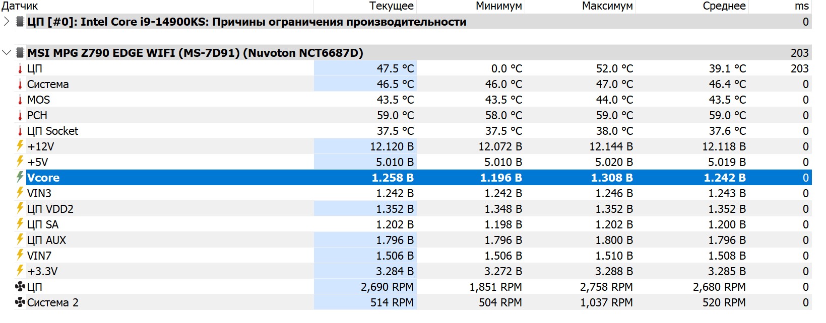 Dark-Forest не очень понятно, что значит "в простое". У меня процессор настроен по самые уши, и стоит фикс вольтажа, поэтому у меня в простое напряжение не снижается. В стоке напряжение в полном простое будет падать до 0.75-0-.85 В. Если оно 1.3+, значит, есть незначительная нагрузка, а не полный простой. Но собсно, на 14900кс обычно может пулять до 1.45+, так что 1.35 - очень даже норм для стока) Короч, нужны скрины.