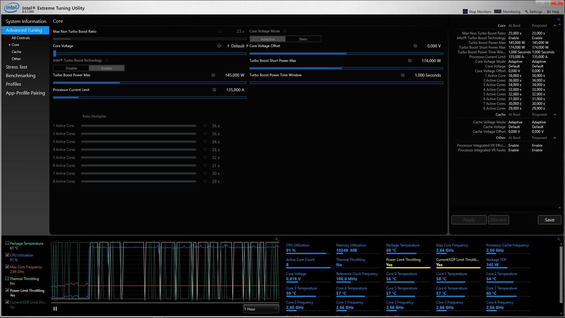 Проблема не в падении частоты как таковой, а именно постоянный - даже в простое - Current/EDP limit и изредка Power limit. Насколько помню, в постоянной нагрузке без анлока турбобуста камень выдаёт честные 2,6 по всем 18 ядрами - распределение частот в зависимости от числа активных ядер, по-моему, XTU на одной из вкладок именно такое и говорит. Утром запущу файл и посмотрю частоту. Также как и указанные настройки в Биос.
