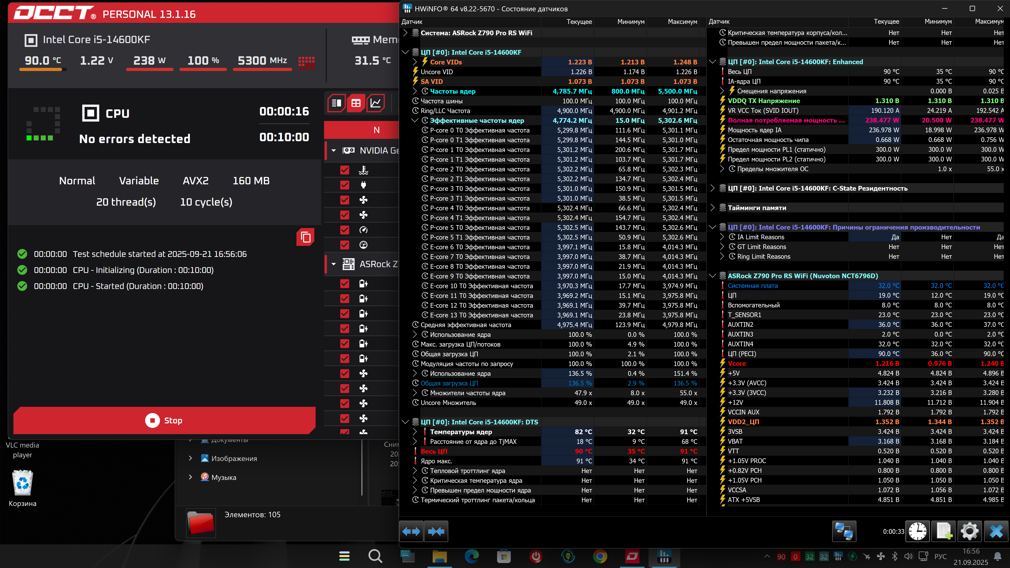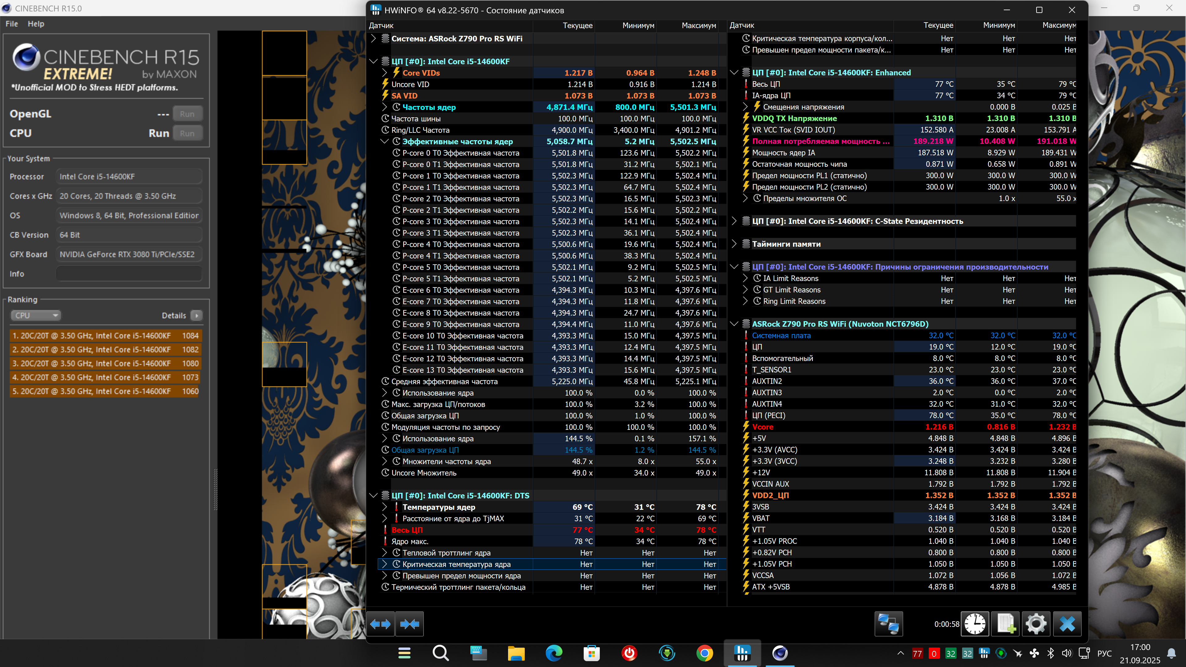 короче сейчас PL1|2 300 выставлены, Ia vr voltage 1.43 и получается, что Occt sse норм и R Extr, а вот Avx2 частота падает до 5300 и по HW ограничение Ia reasons; в R23 частоты не падают, но ограничение Ia reasons. А в Осст Е ядра вообще до 4000 проваливаются, что avx2, что sse