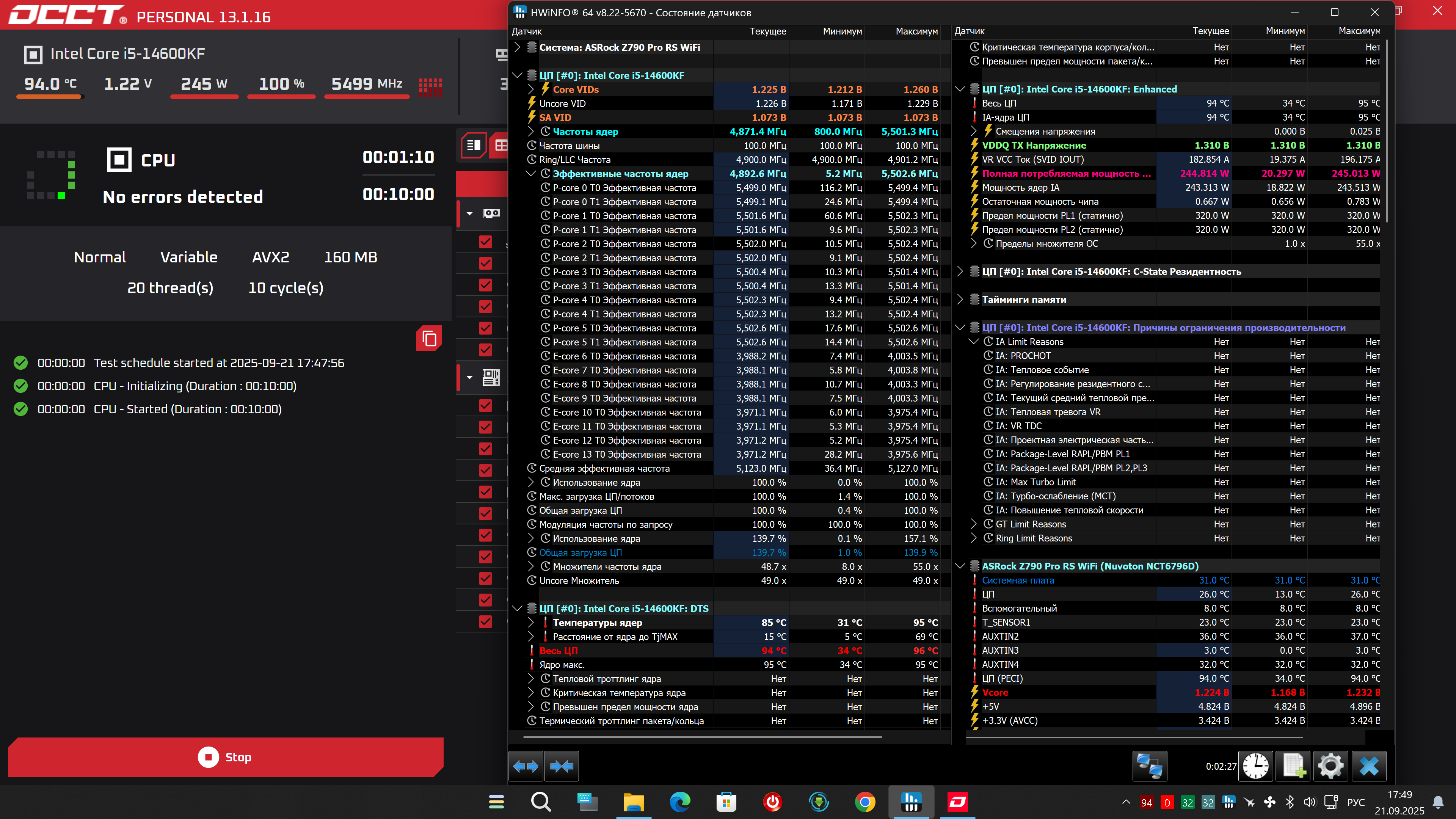 Дополнение 1: Поднял PL 1 & 2 до 320, Ia reasons в HW пропало, Осст avx2 P ядра 5500 стали (Е также 4000 остались), в R23 5500/4400.....НО, по попугаям, что в R23, что в OCCT производительность упала, не намного, например в R23, было 26 650 стало 26 450
