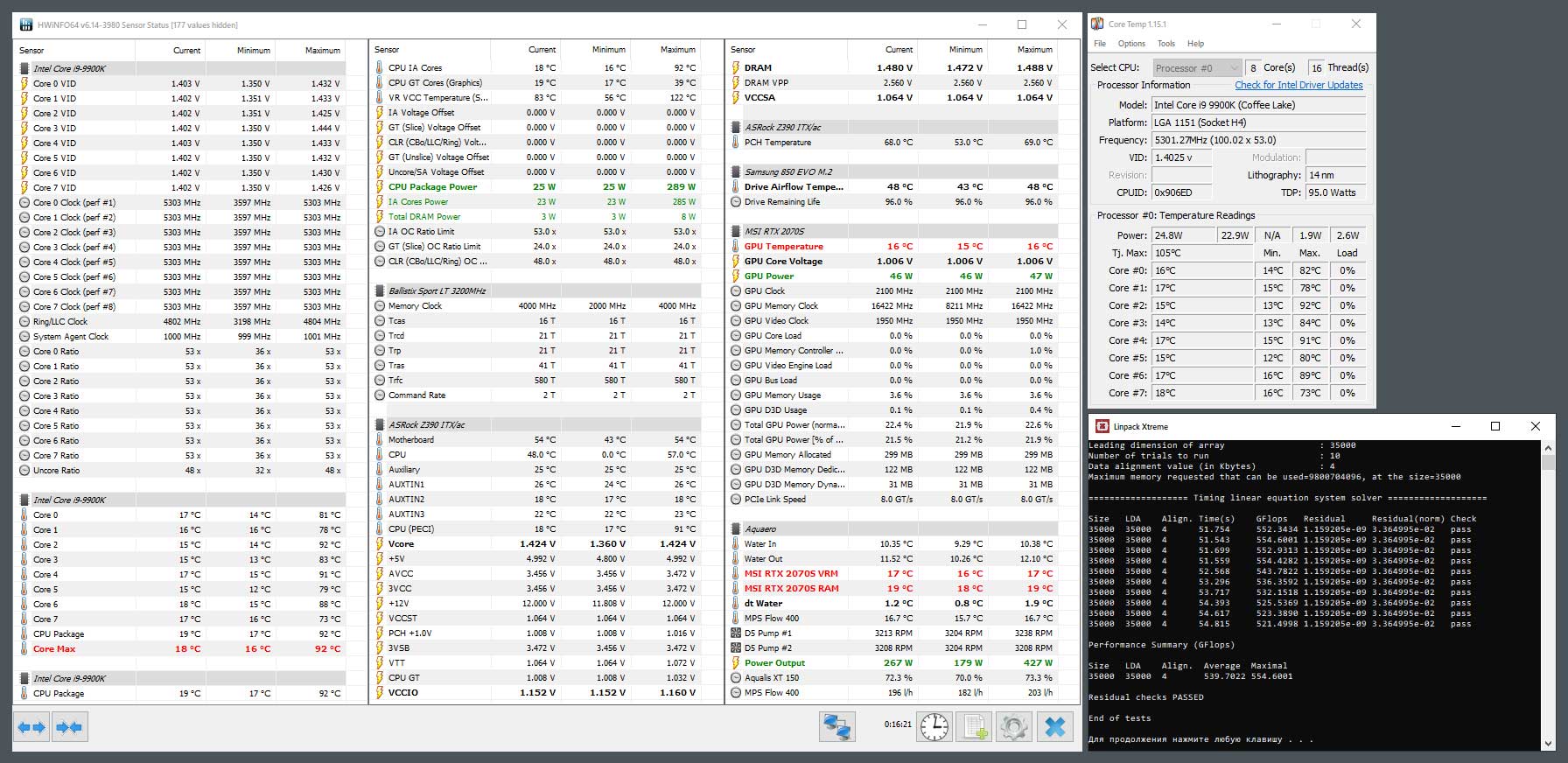 Полученный результат должен иметь следующий вид: Скриншот рабочего стола после прохождения >9 циклов (т.е. между 9 и 10 проходами). Вместе с LinX на рабочем столе должны быть развернуты CPU-Z (первая вкладка) и Core Temp, это обязательный минимум. Такой набор программ даст информацию о напряжении и температурах под нагрузкой-простоем. По желанию можете добавить другие программы, показывающие дополнительную информацию о вашей системе, например третью вкладку CPU-Z, которая покажет модель материнской платы и версию BIOS. Пример результата разгона: Mad Max, 5100 МГц (AVX 0), i7-8086K, HT-ON, Cache 4700, Vcore=1.36V, Batch L805E123, Gigabyte Z370 Aorus Gaming 7 (bios F6), Be Quiet! Dark Rock Pro 4, ЖМ под HS, Windows 10 Pro 64-bit 1809, LinX 0.9.3 64bit.