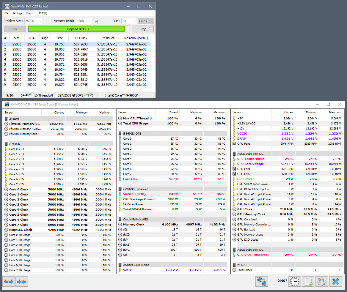 aggression Конечно уверен. 5 проходов линх это наичем. И на втором скрине у вас 99 градусов на ядре, на пределе.Думаю на проходе 10-15ом уже ядро свалится и тест провален. У моей башни заявлено 320 тдп(с вертухами 3200об), при 250 ваттах с проца температура 87-90 при 1000 оборотов. С полированной крышкой, основанием и жм на кристале. Чтобы отвести 280-290 ват надо осенью на балкон с системником выходить! Это при условии, что не вся подошва куллера лежит на крышке проца. Там еще много факторов конечно. Но 280 ватт с разогнаной памятью воздух не удержит.