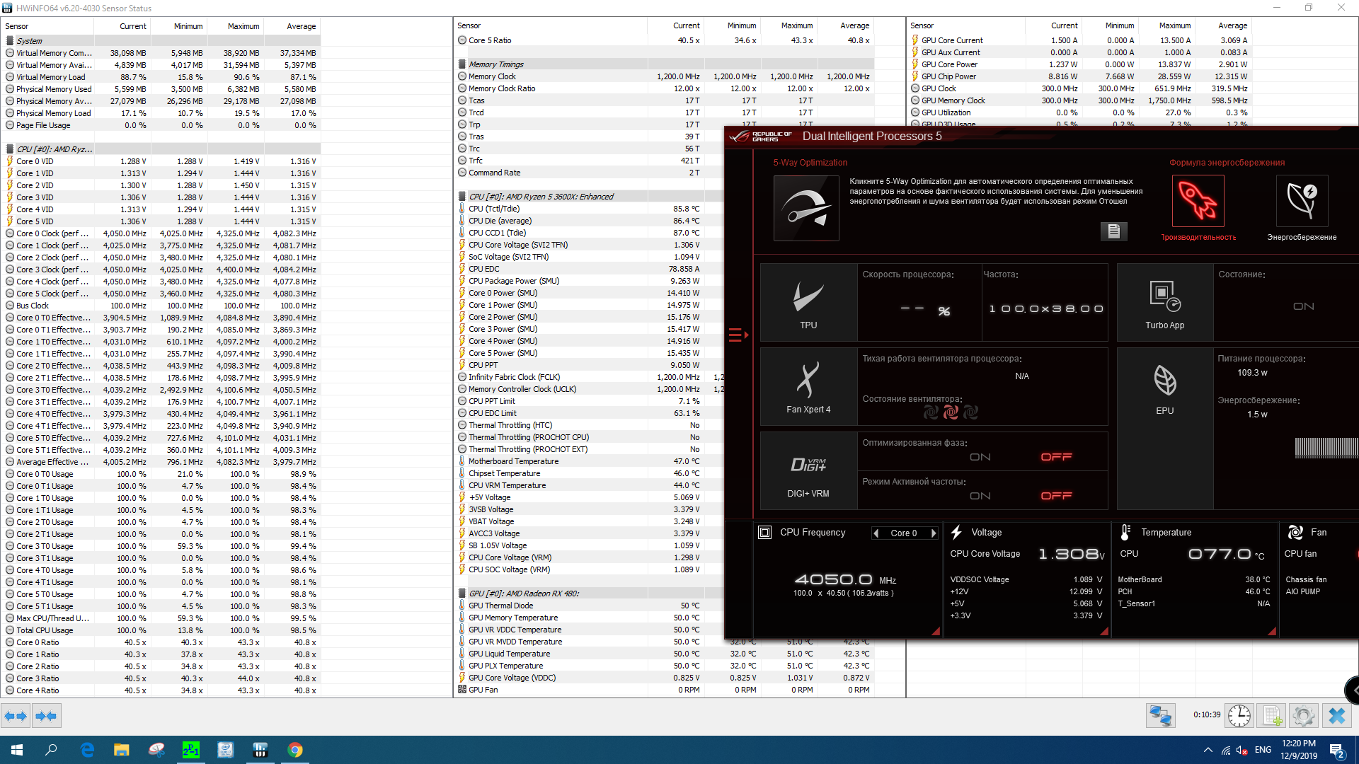Обновил систему до 3950X, MSI PRESTIGE X570 CREATION. Проц по дефолту. План 1usmus. Память пытаюсь стабилизировать на 3600 (32Гб G.Skill F4-3200C14D-32GVK), но пока безуспешно. Возможно придётся снижать частоту. Буст был до 4725МГц на одном ядре.