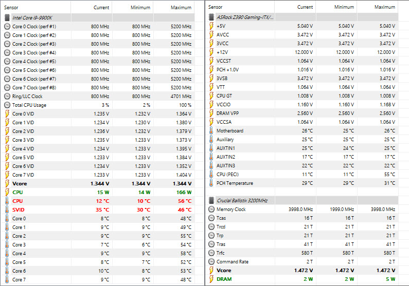 Предельные значения температуры и энергопотребления разогнанного Intel Core i7-9700K при прохождении тестирования в Prime95 29.4 (при полной восьмипоточной нагрузке SmallFFT c AVX, охлаждение Corsair Hydro Series H115i)