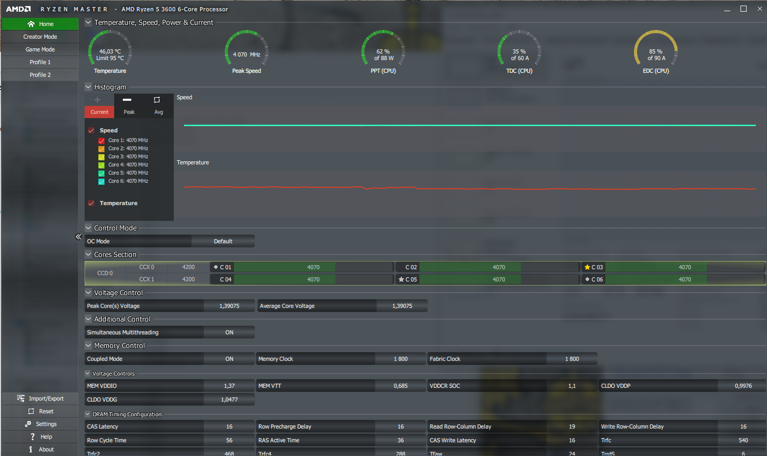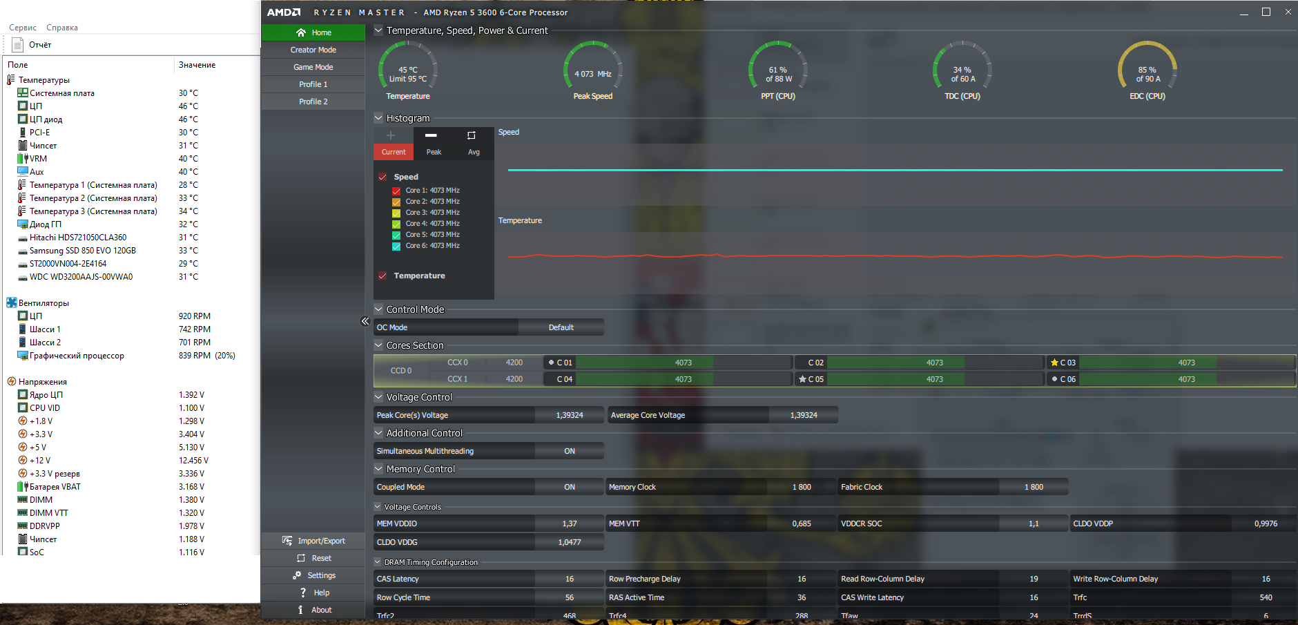 Товарищи, что можете сказать про температуры и вольтаж под нагрузкой testmem5 от 1usmus? Биос стоит последний F50, выставлены вручную обороты кулера ЦП через биос. Скачки температуры не понятные в простое от 30 до 60, под нагрузкой от 47 до 60 градусов. Кулер Gammax 400 (алюминиевые прослойки относительно холодные). И да, заметил, что PBO странно работает, буст под нагрузкой (на скрине видно) в районе 4,07Ггц, это нормально? По паспорту же 4,2Ггц?
